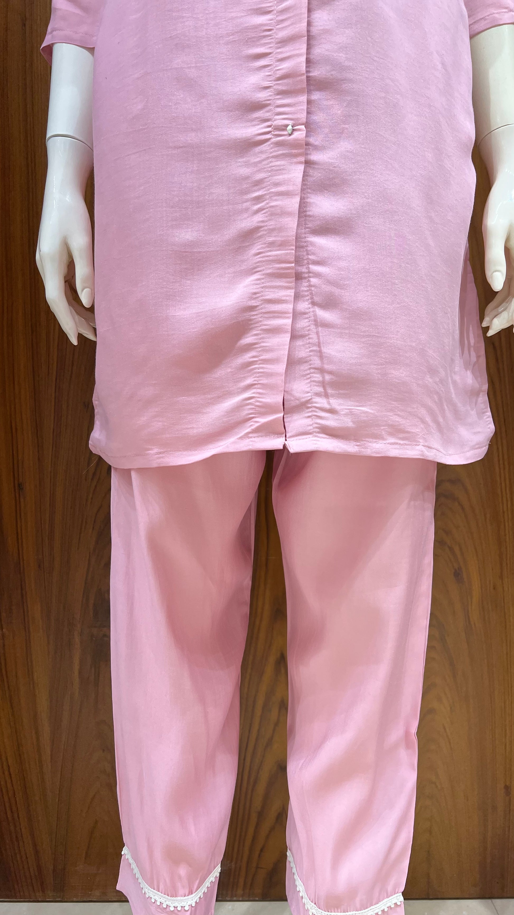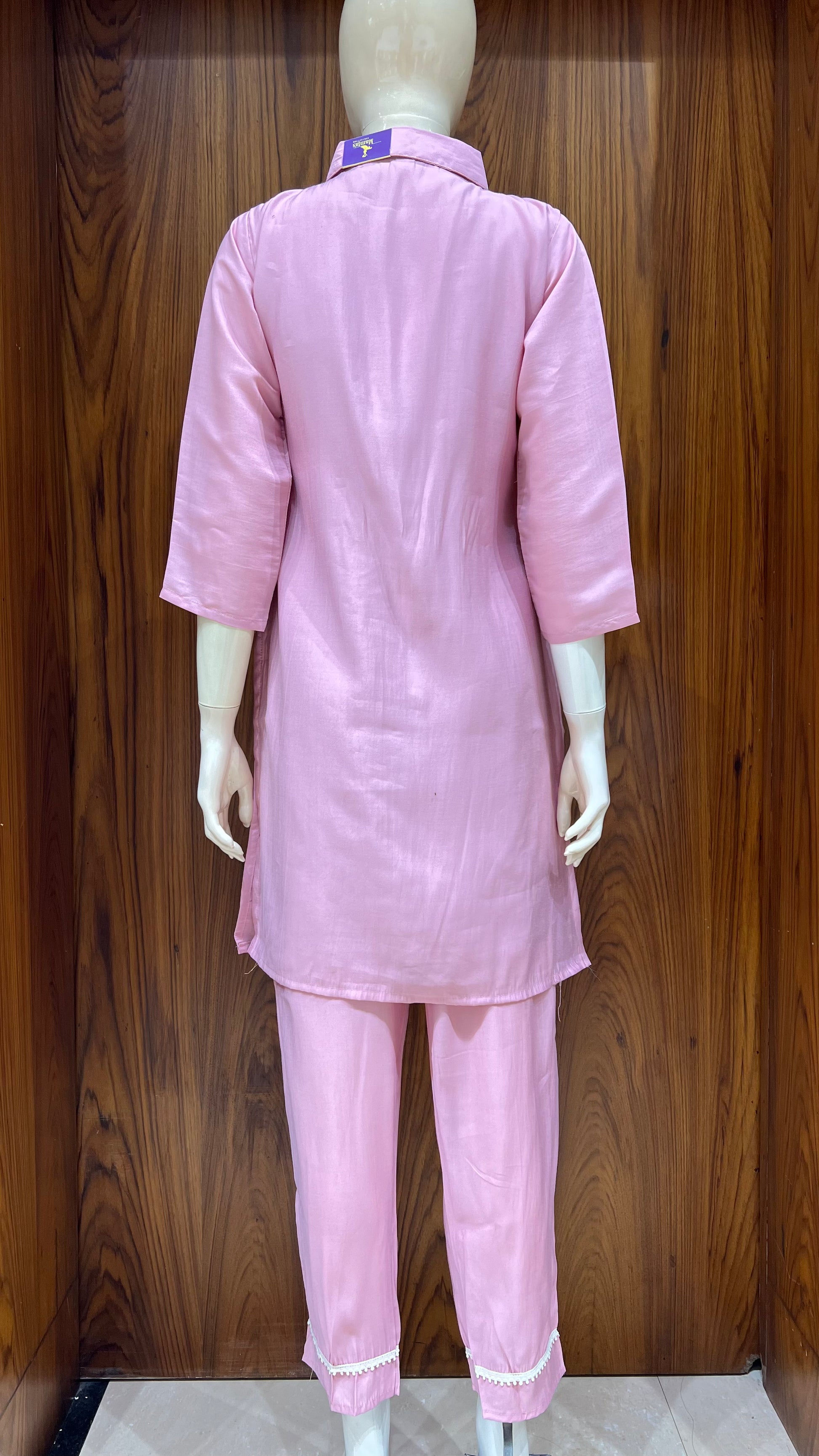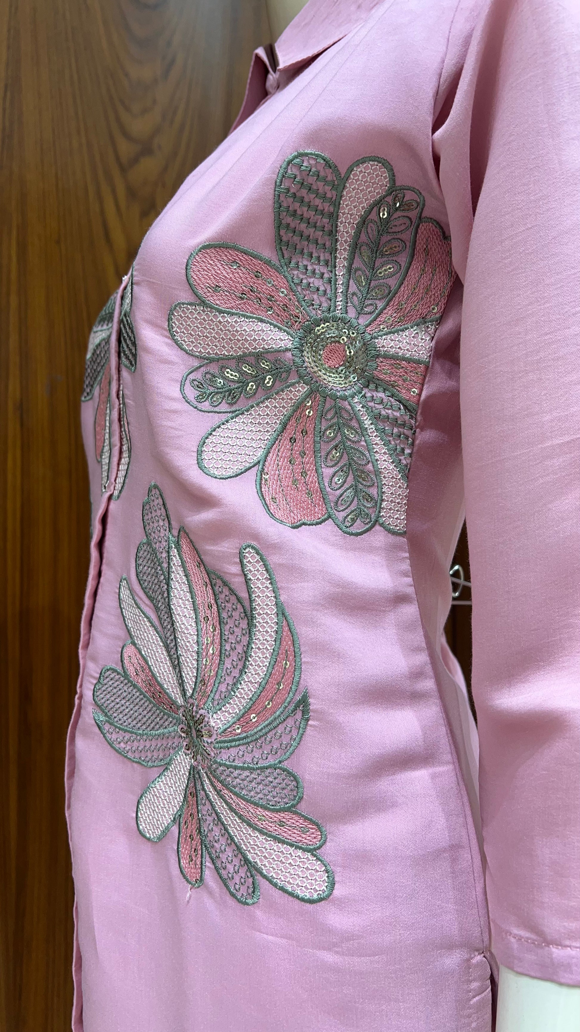 Showcase your unique sense of style with our "Artisan Bloom" Co-ord Set. This two-piece ensemble is a beautiful blend of contemporary design and artistic embroidery, perfect for the modern woman. The lovely dusty pink fabric is adorned with large, stylized floral motifs in a sophisticated and modern color palette, creating a look that is both chic and distinctive.