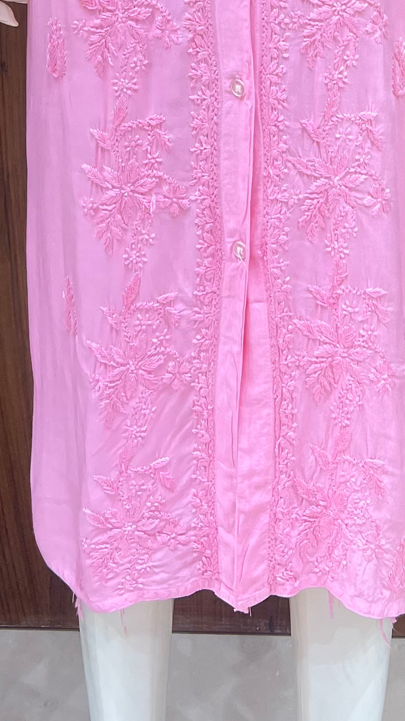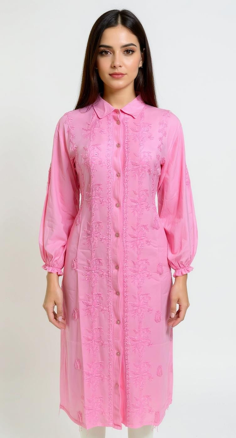 Add a modern twist to your ethnic wardrobe with this elegant blush pink shirt-style kurta. Crafted from soft, breathable fabric, it features full front button closure, a classic shirt collar, and intricate tonal floral embroidery from top to bottom. The puffed long sleeves with gathered cuffs bring a contemporary vibe to this graceful piece.