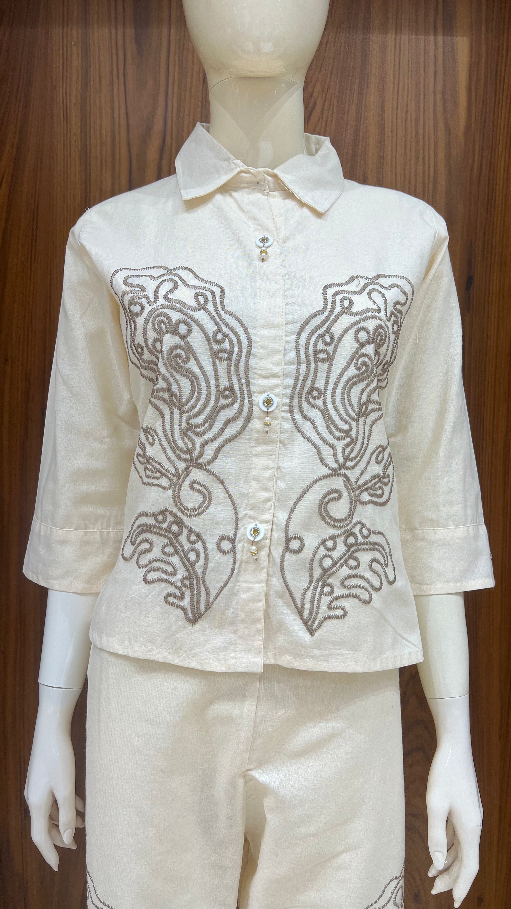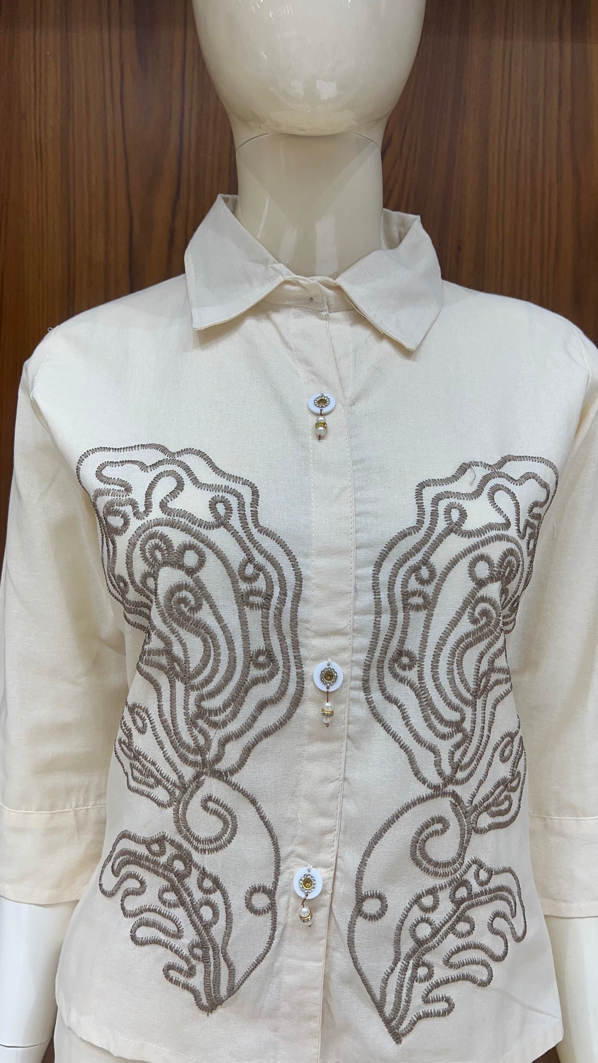 Discover a masterpiece of contemporary design and artistic expression with our "Earthen Scrolls" Co-ord Set. This two-piece ensemble is a sophisticated fusion of a modern silhouette with intricate, large-scale embroidery. The elegant off-white base and earthy-toned motifs create a look of understated luxury, perfect for the woman with a refined and artistic sense of style.