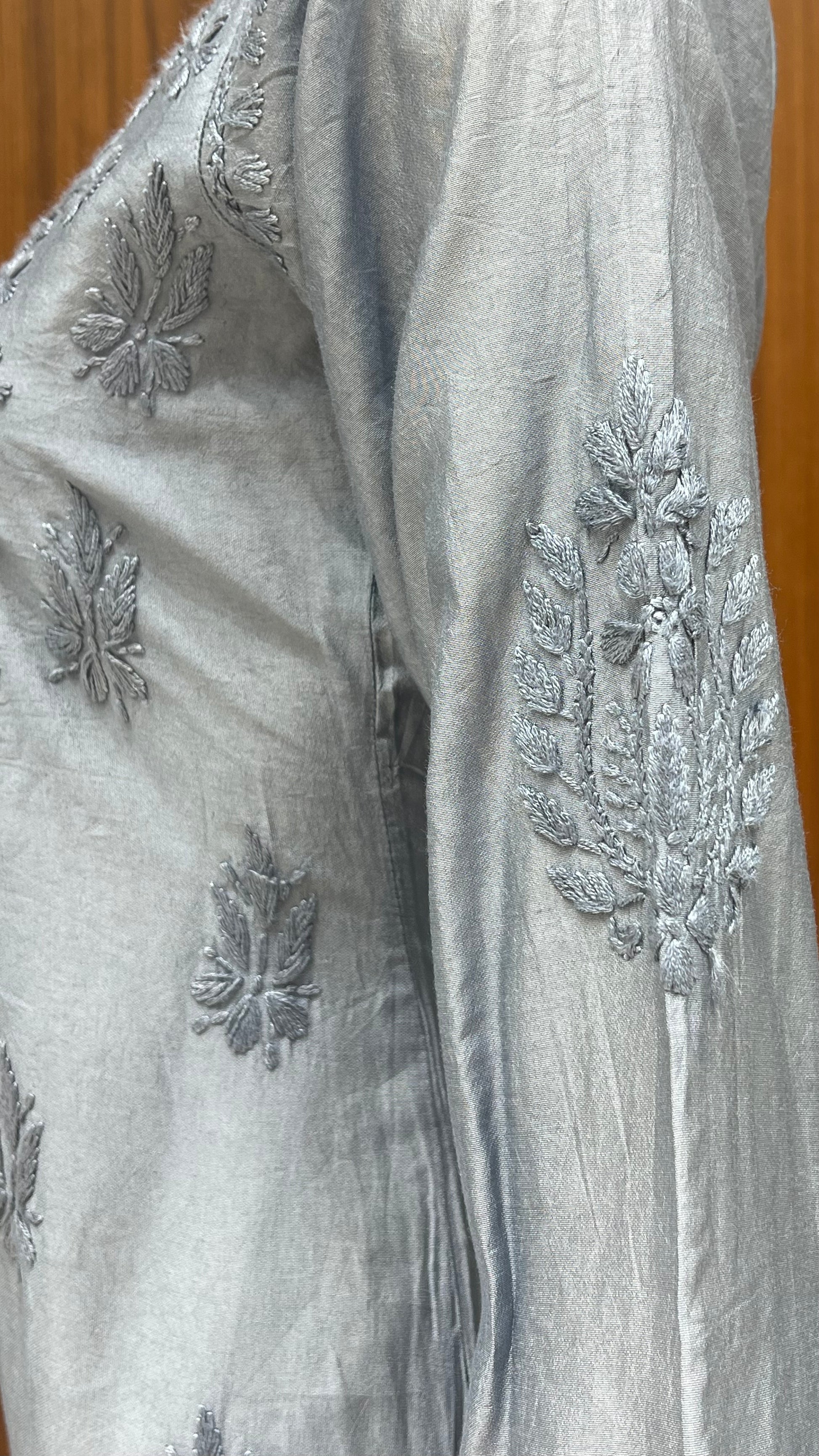 Elegant Grey Tone-on-Tone Self-Embroidered Kurti with Full Sleeves