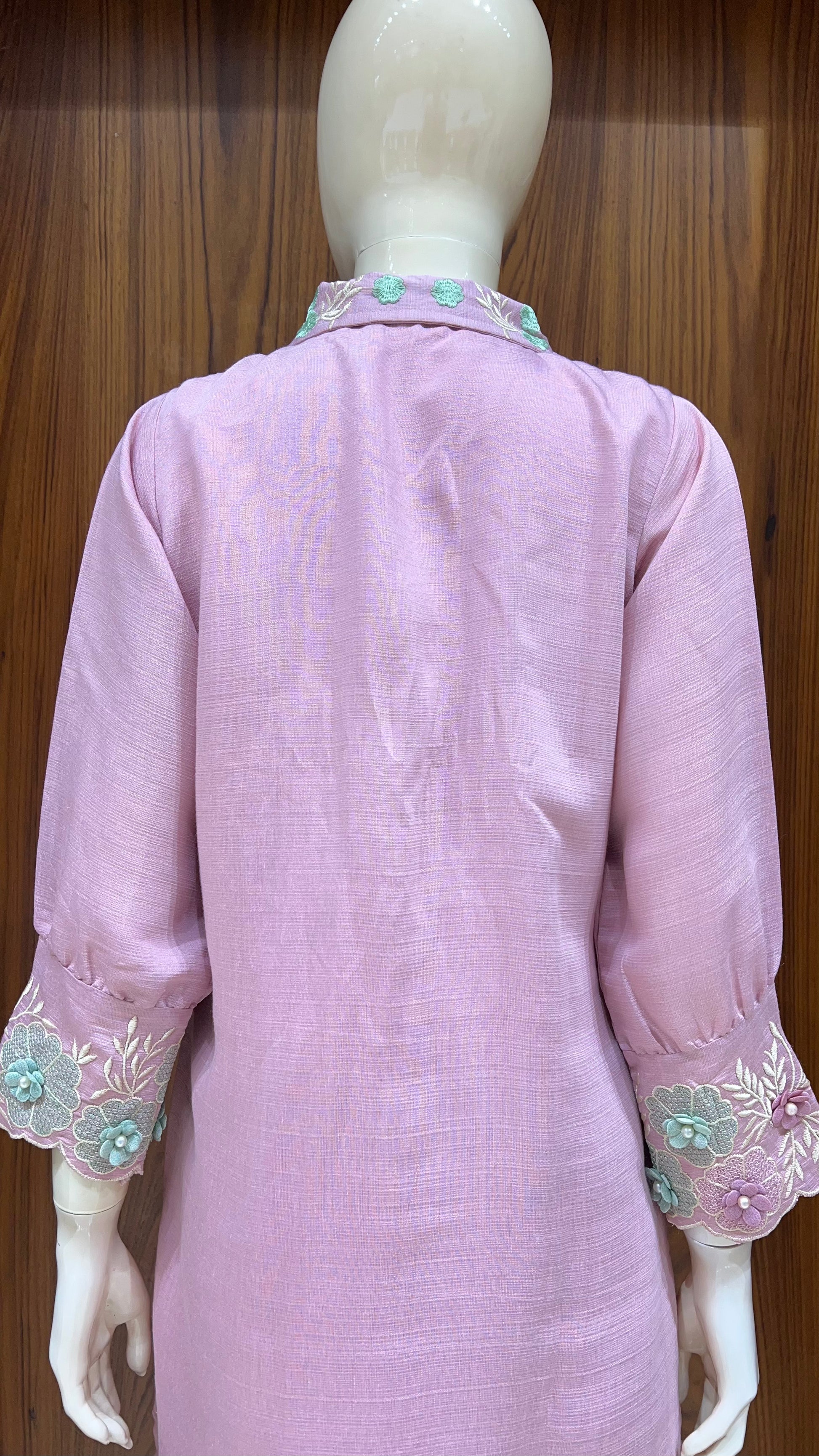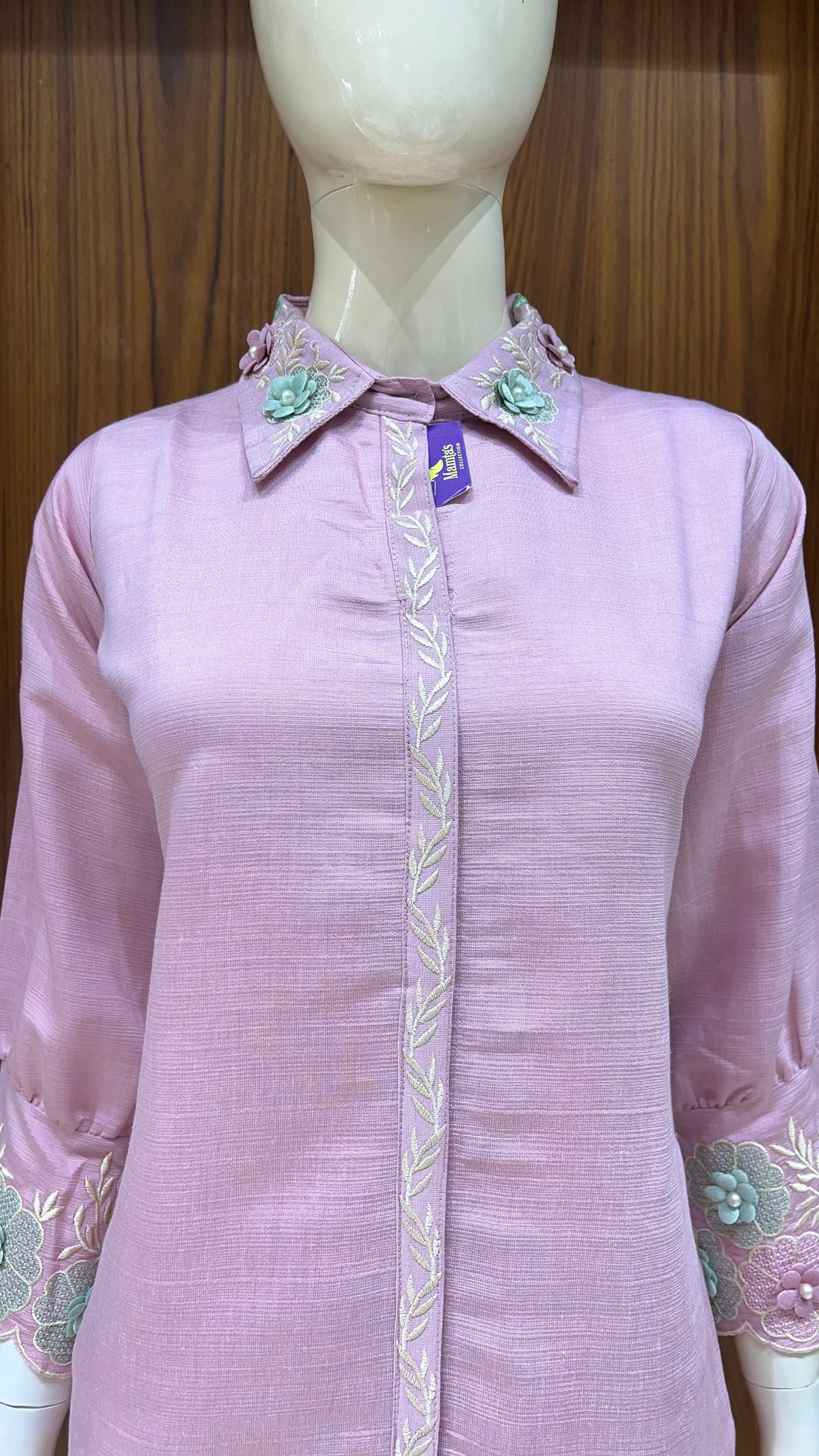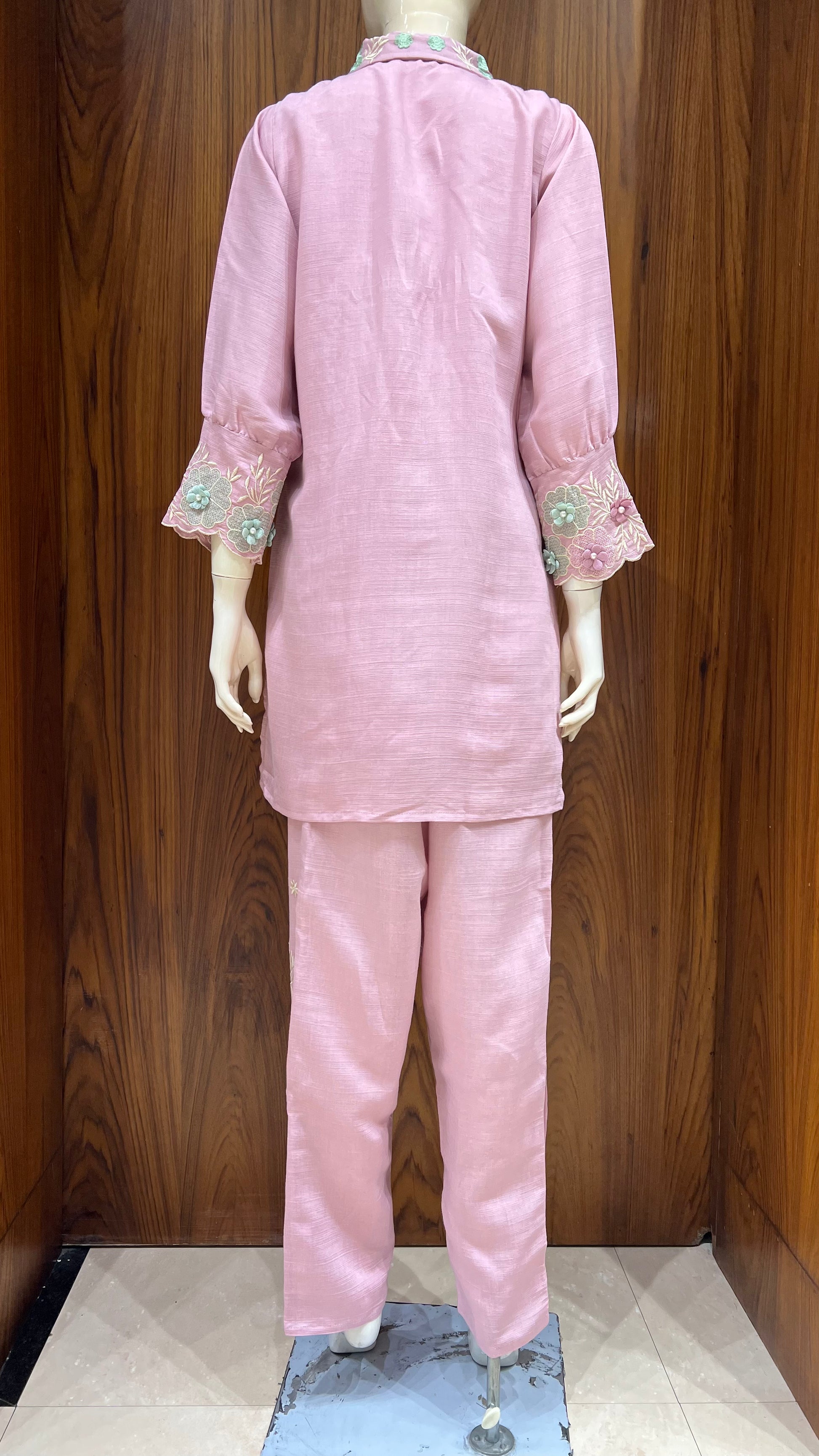 Step into a fairytale of fashion with our "Enchanted Garden" Co-ord Set. This breathtaking two-piece ensemble is a masterpiece of design and artistry, featuring exquisite three-dimensional floral applique that seems to bloom right off the fabric. The sophisticated dusty pink base is beautifully complemented by the soft pista green florals, creating a unique and romantic color story.
