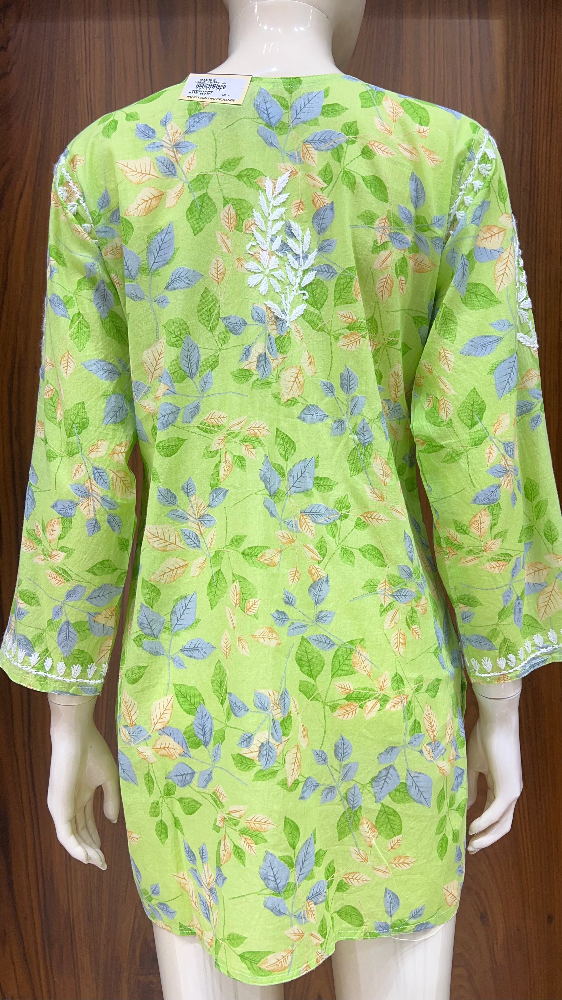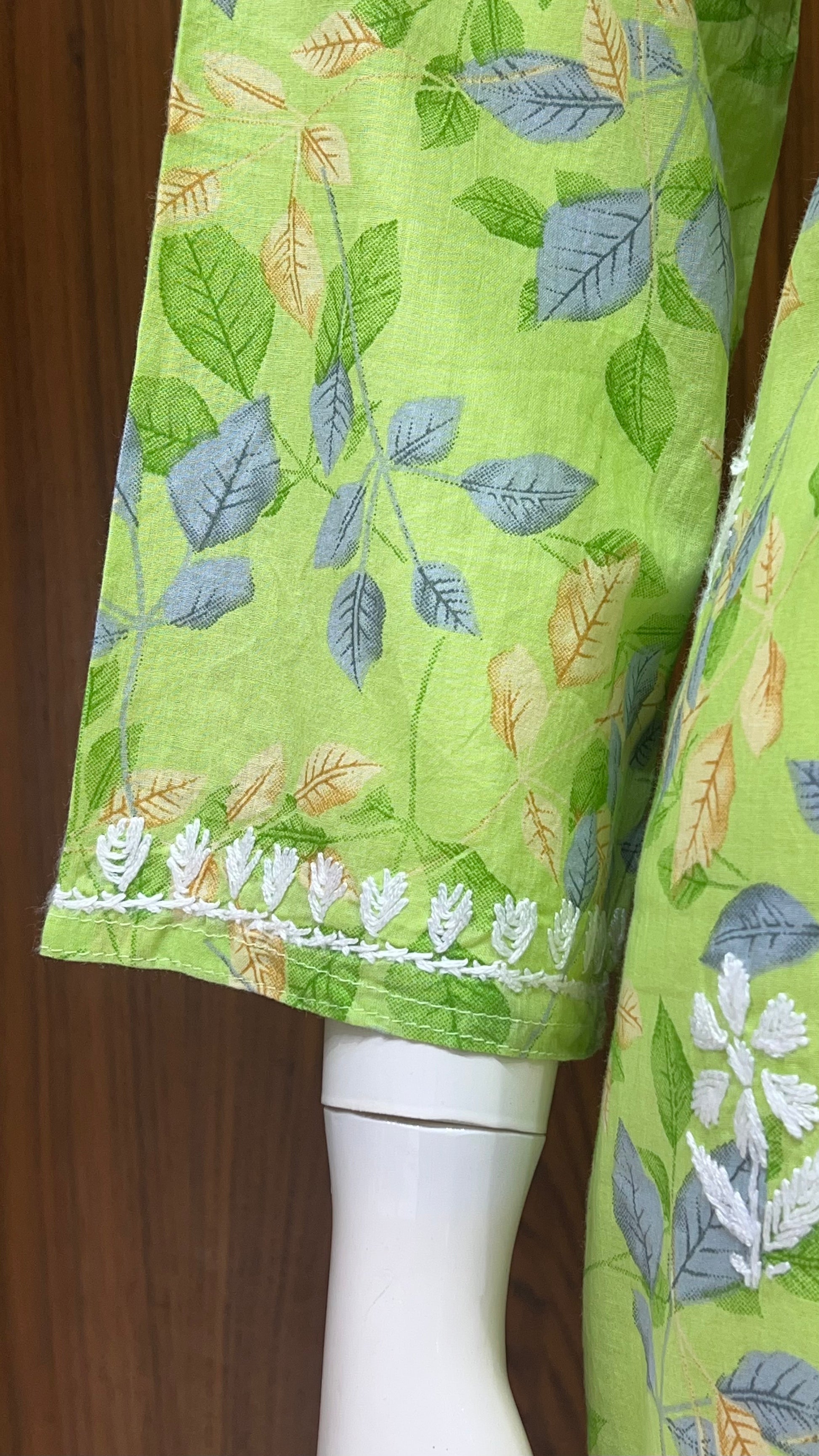 Fresh Green Leaf-Printed Kurti with Embroidered Yoke and 3/4th Sleeves