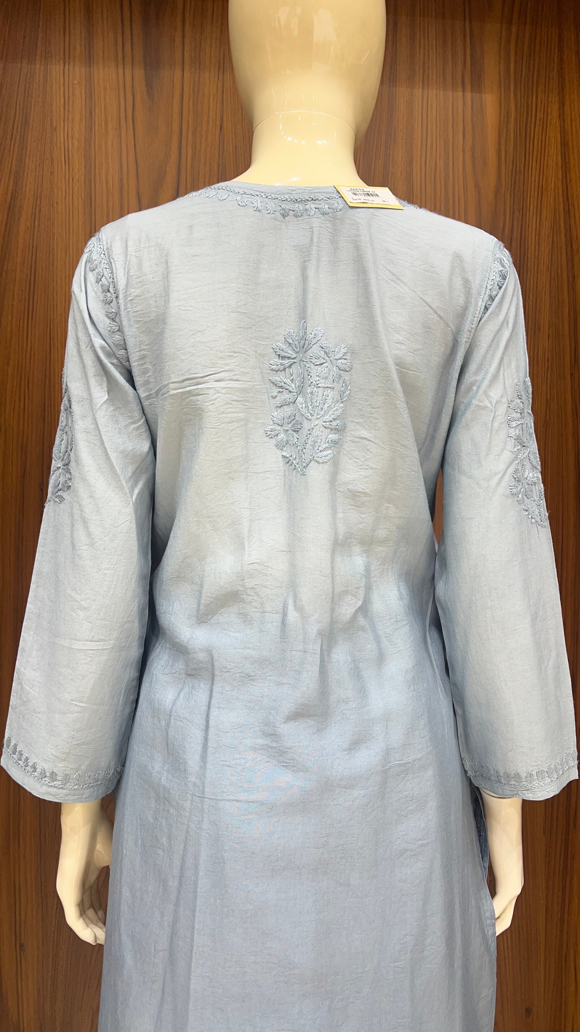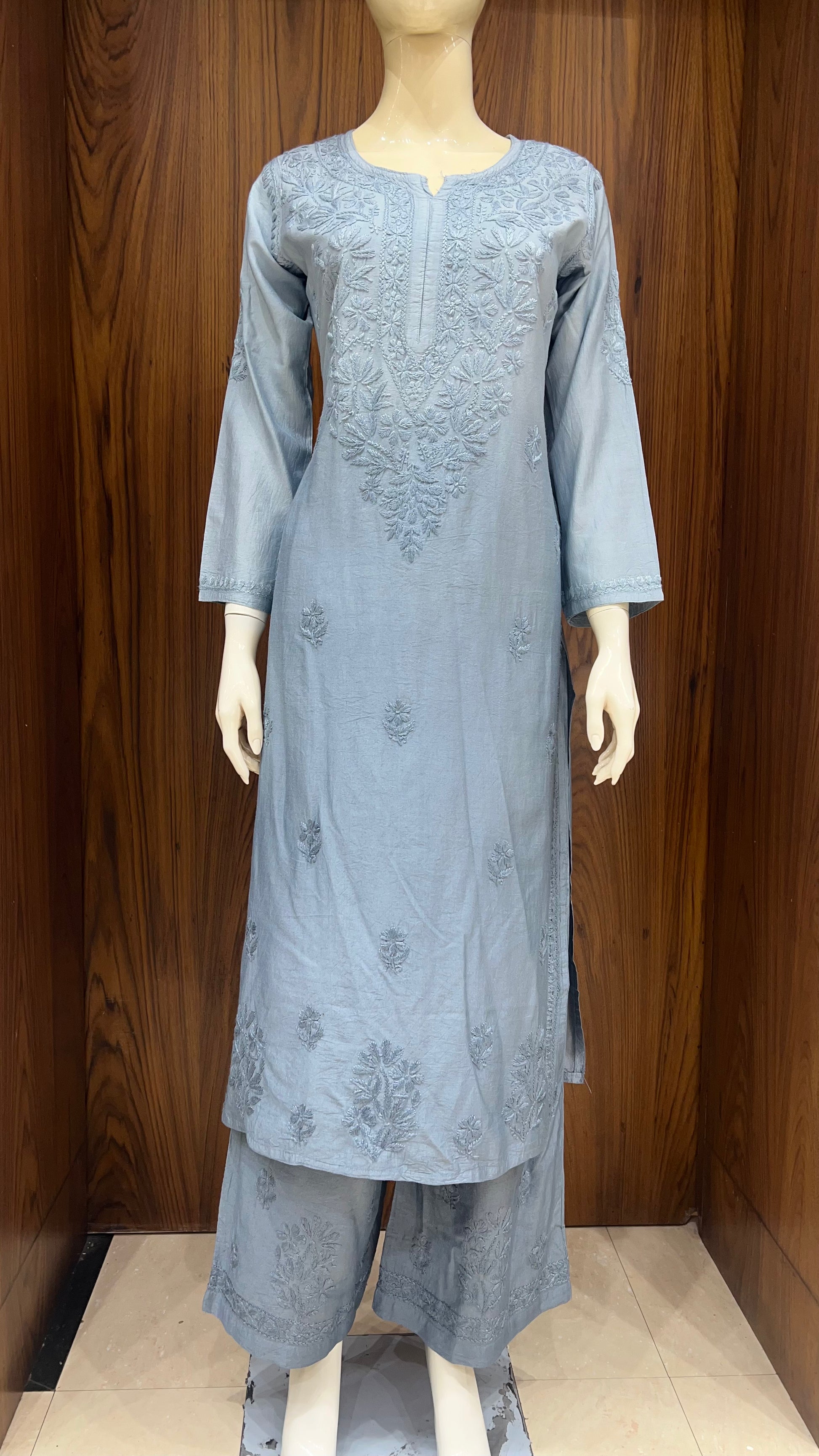 Grace your wardrobe with this elegant slate blue co-ord set, detailed with tonal floral embroidery that exudes understated charm. The straight-fit kurta features delicate embroidery at the neckline and hem, adding a refined texture and ethnic flair. The matching wide-leg pants carry coordinated embroidery motifs at the hem for a cohesive and polished ensemble.