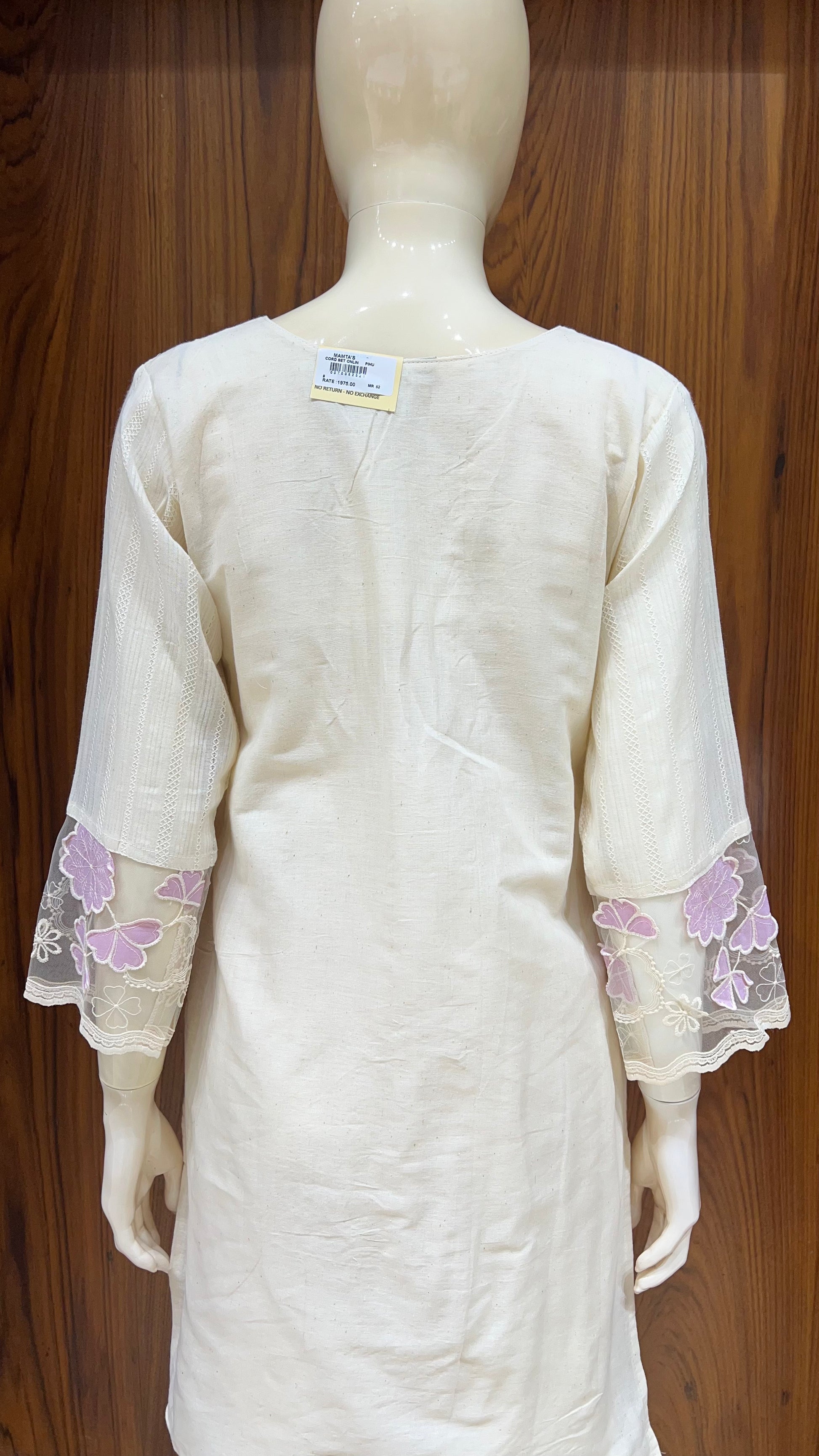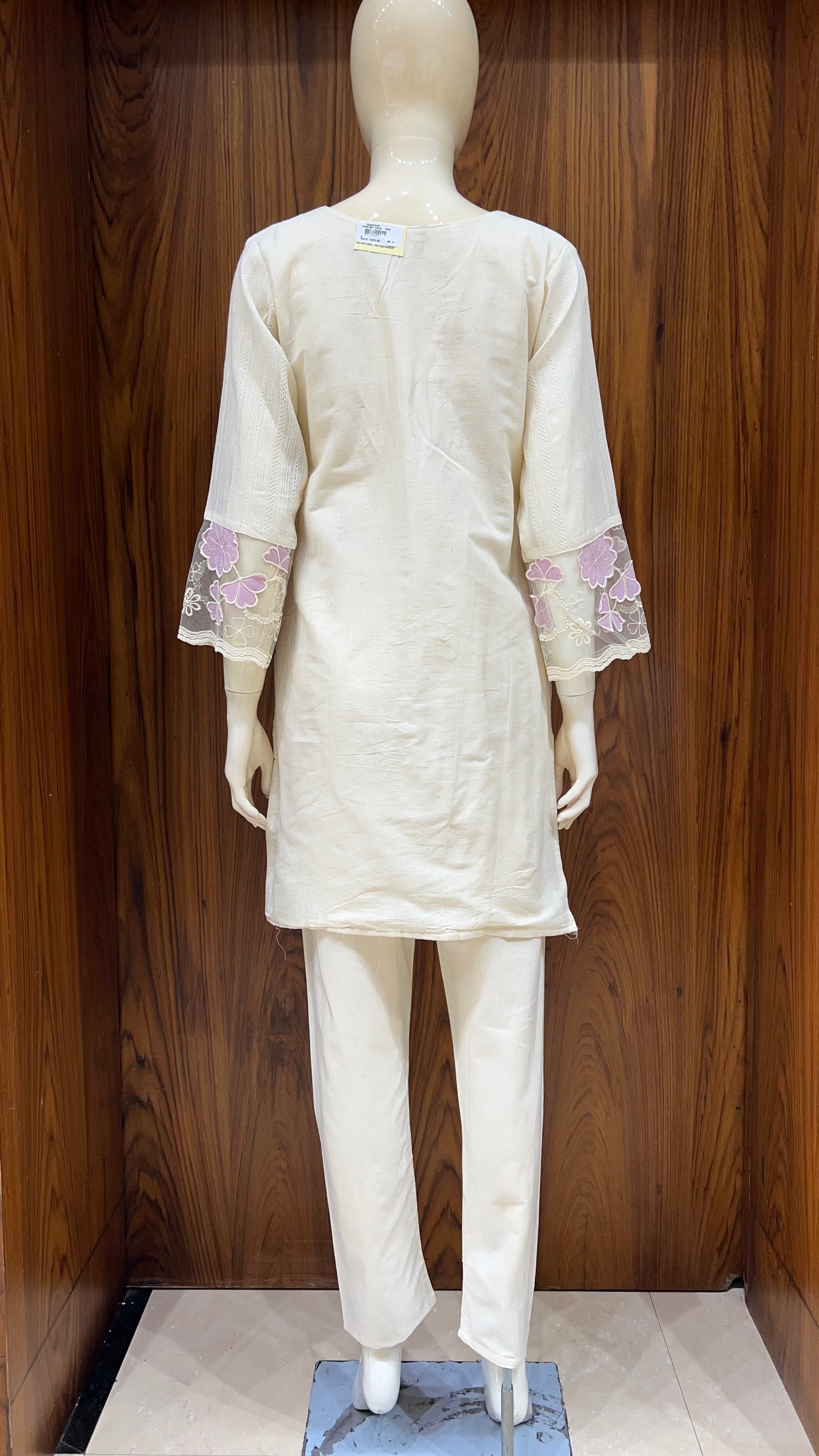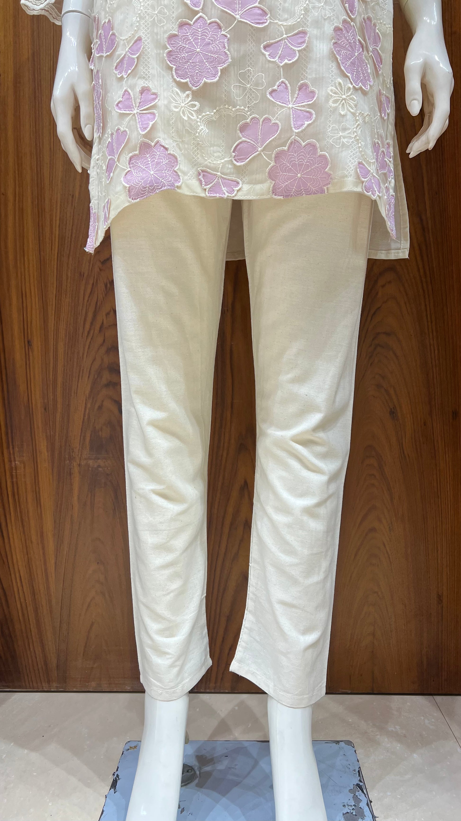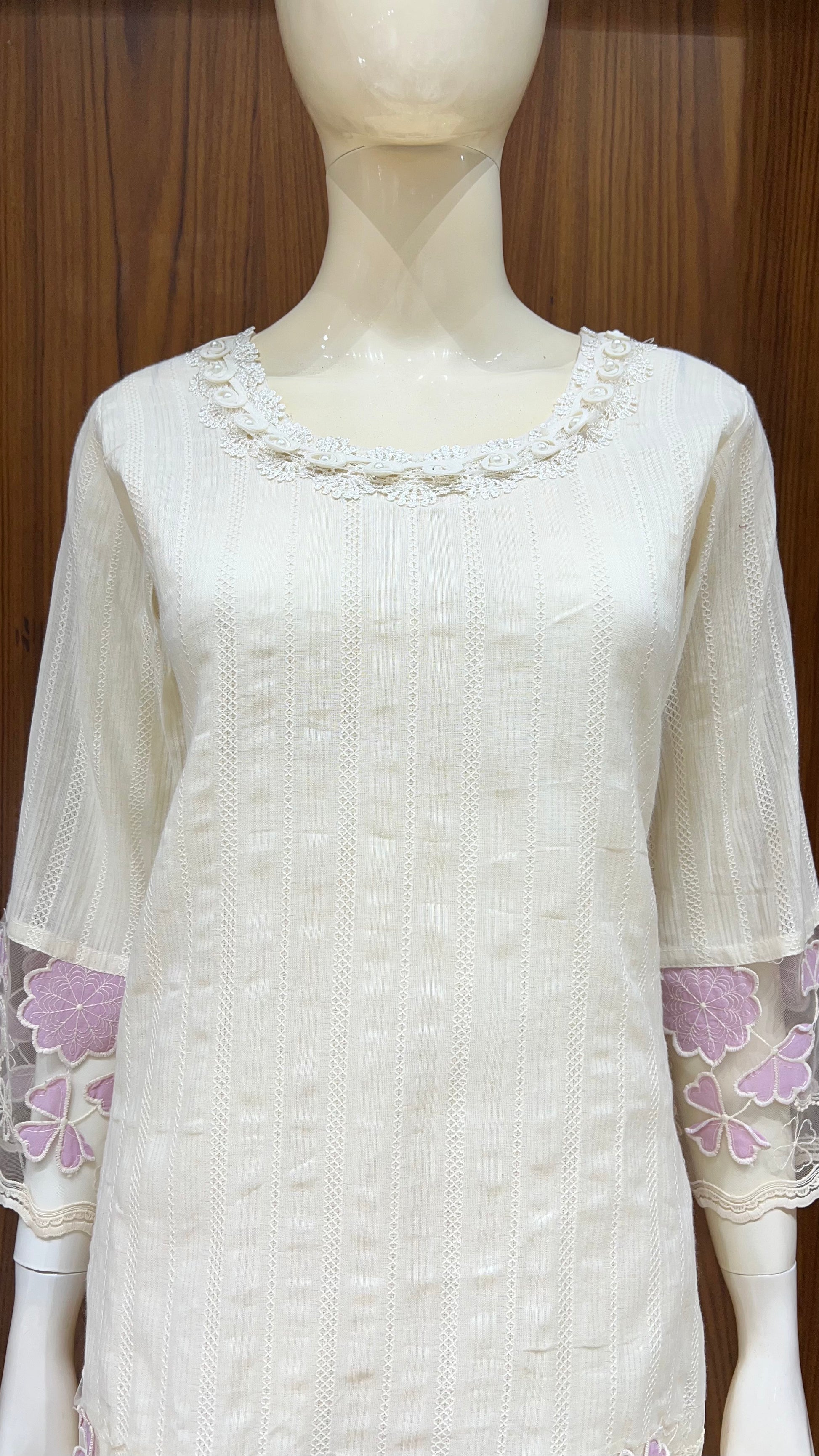 Embody ethereal romance and sophisticated charm with our "Lilac Bloom" Kurta Set. This stunning two-piece outfit is a work of art, featuring a serene off-white canvas brought to life with delicate lilac floral applique. The masterful blend of textured fabric and sheer organza creates a look of understated elegance and high fashion.
