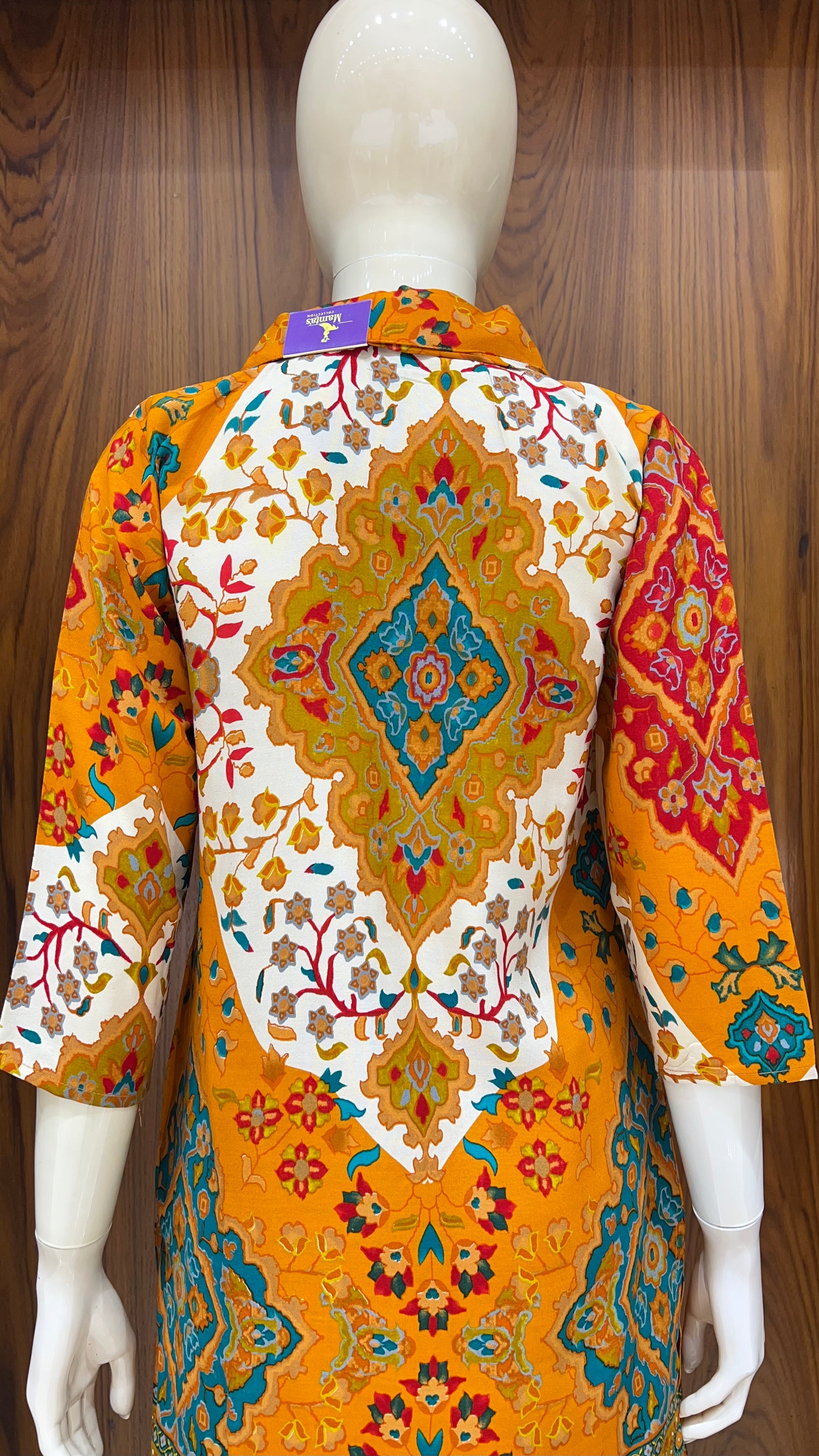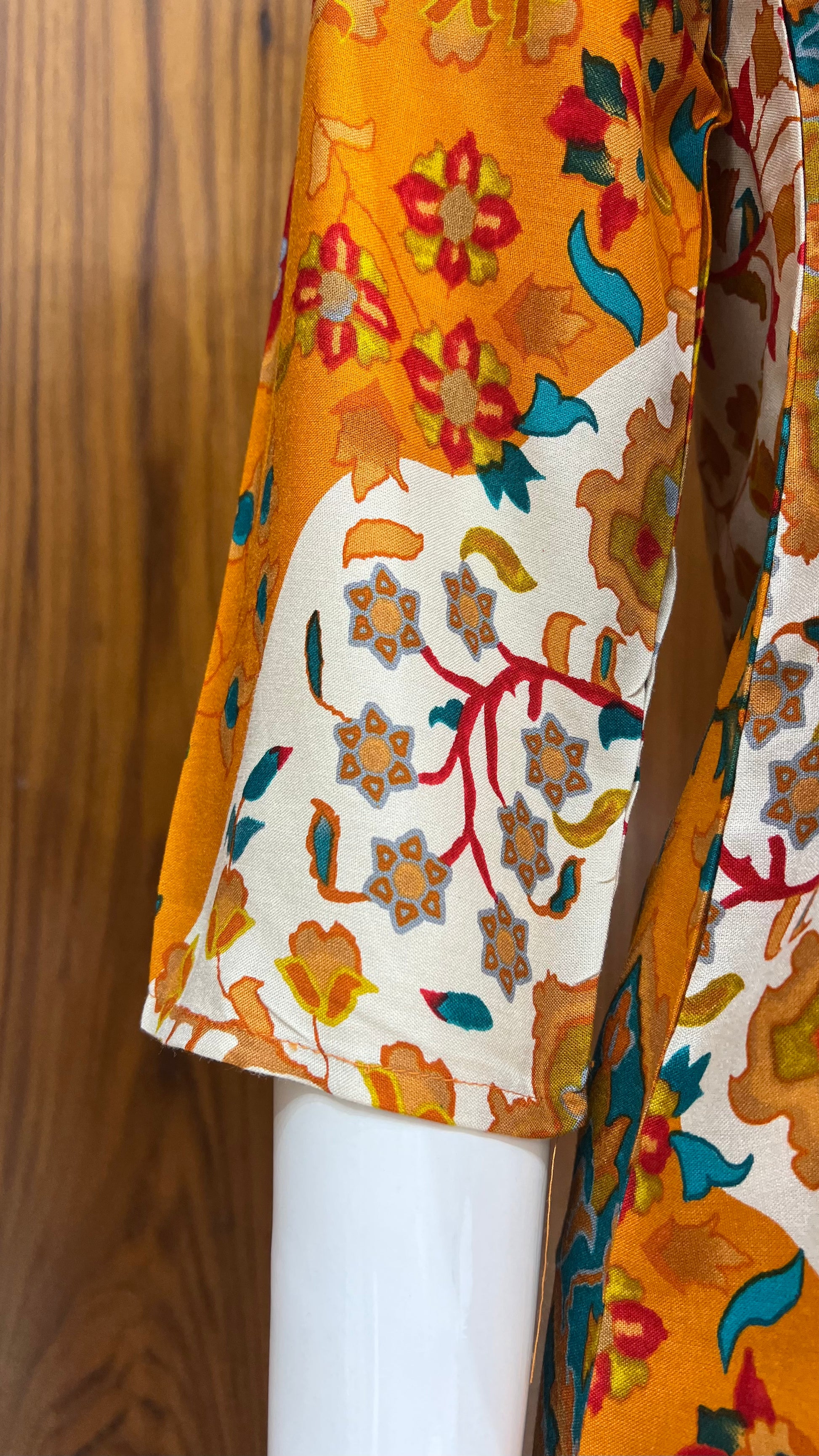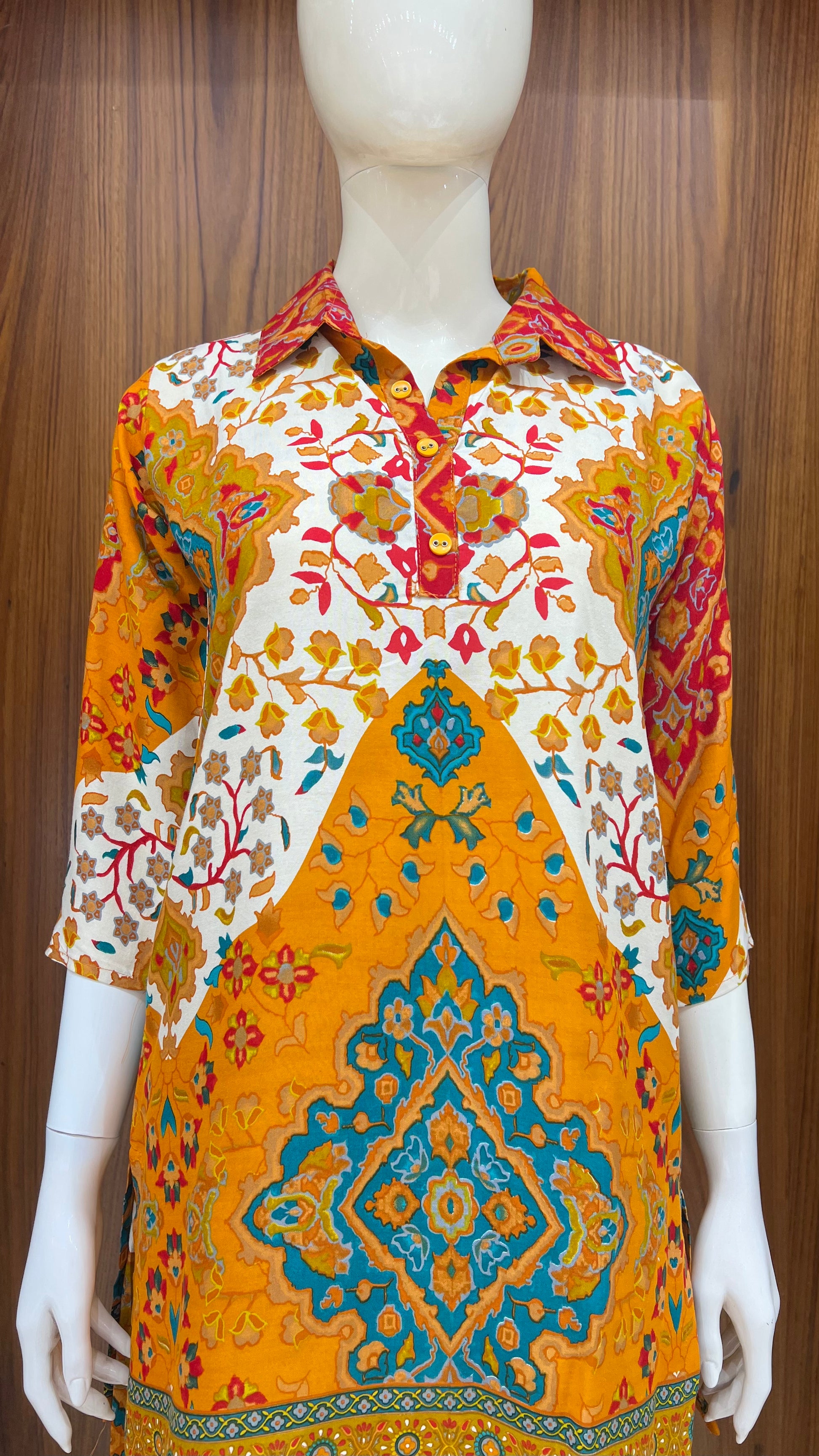"Immerse yourself in a vibrant tapestry of color and tradition with our ""Marigold Medallion"" Palazzo Set. This stunning two-piece ensemble is a celebration of classic Indian prints, featuring intricate patterns and a rich, festive color palette. The comfortable, flowing silhouette makes it a perfect choice for any celebration where you want to look effortlessly beautiful and culturally chic.