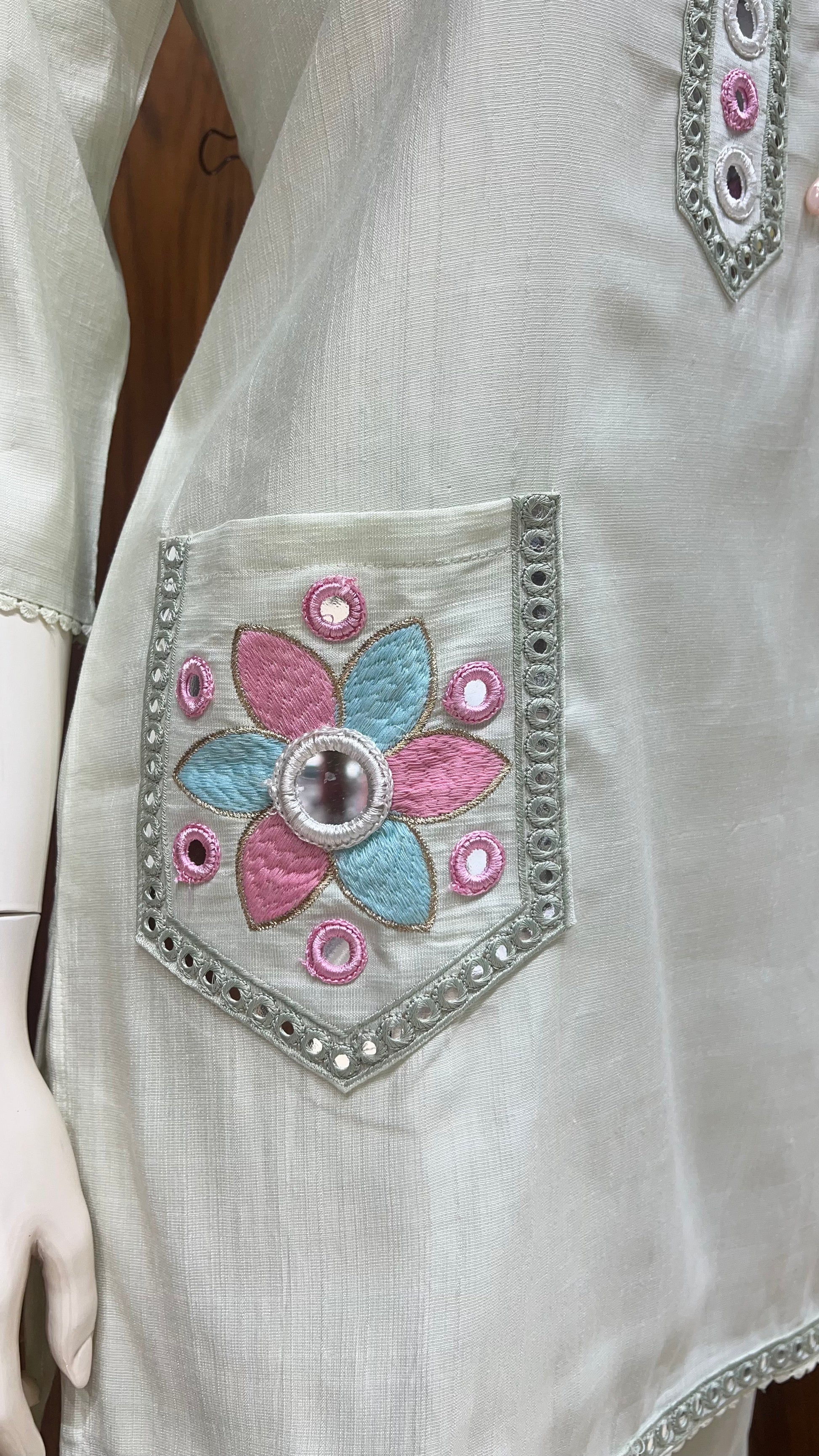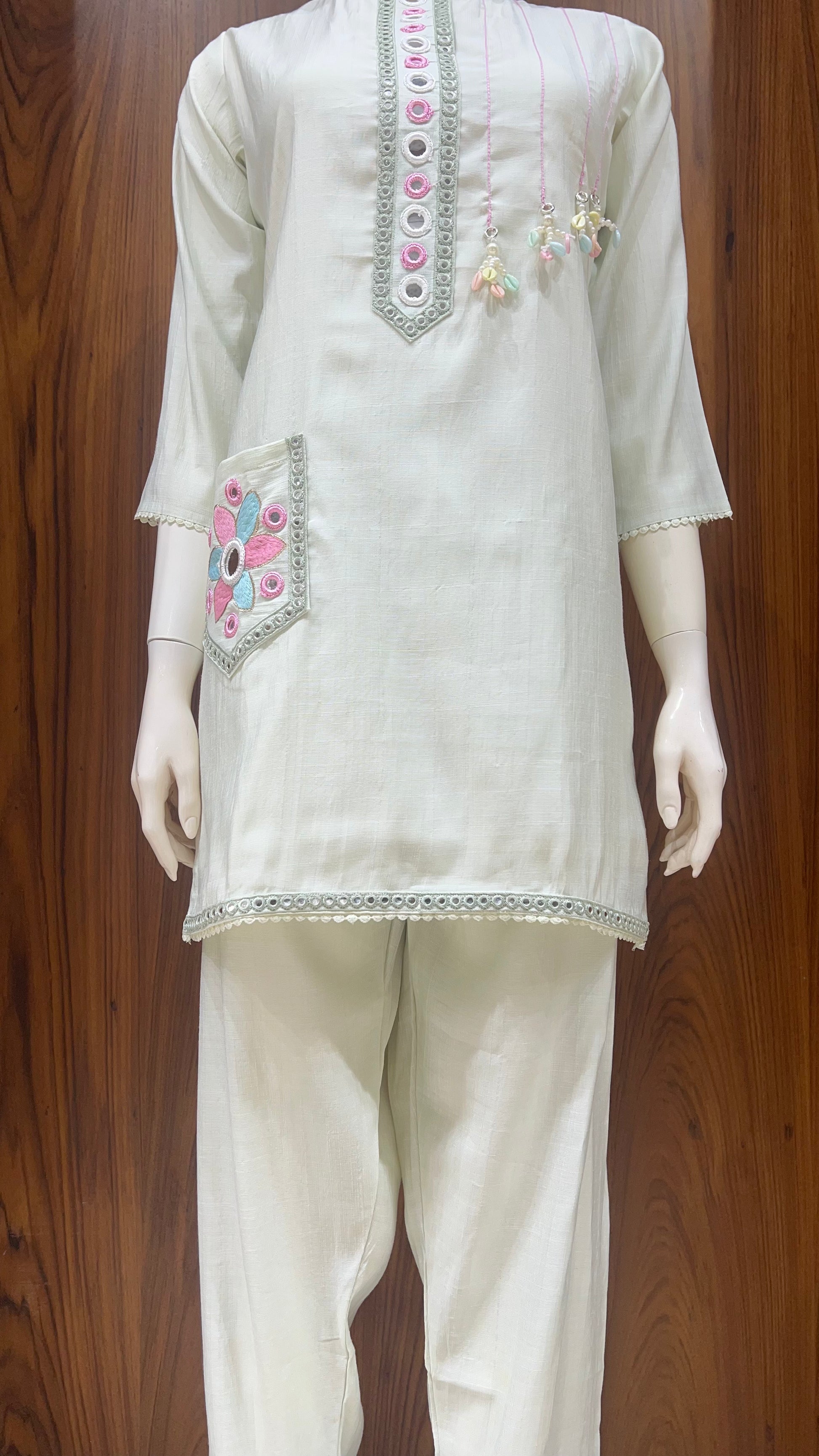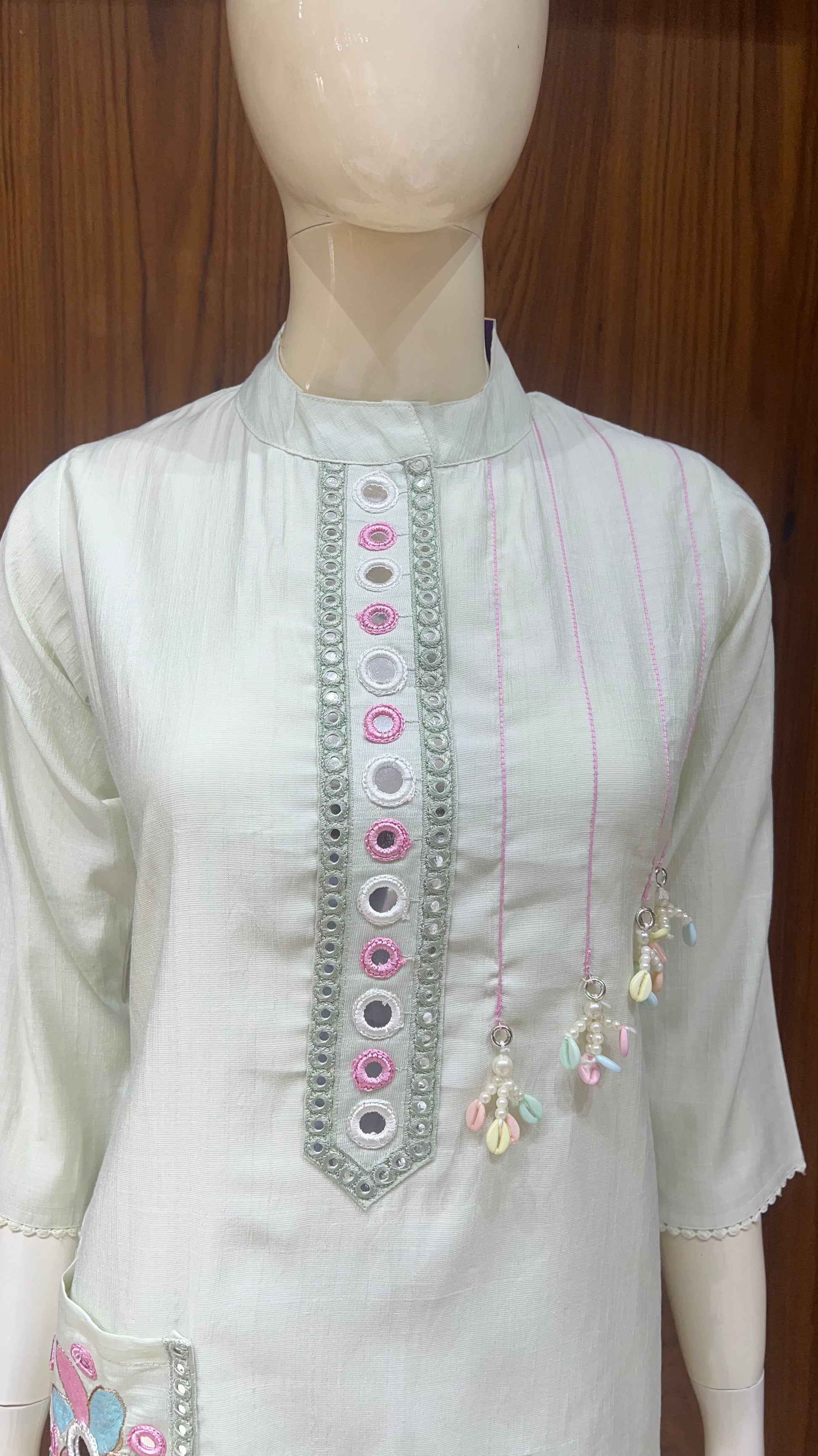 Step into a world of whimsical charm and artful elegance with our "Mint Mirage" Kurta Set. This enchanting two-piece ensemble is a celebration of playful details and traditional craftsmanship, reimagined in a fresh, modern way. The calming mint green hue is beautifully complemented by a delightful mix of mirror work, colorful embroidery, and dangling tassels, creating a look that is truly one-of-a-kind.