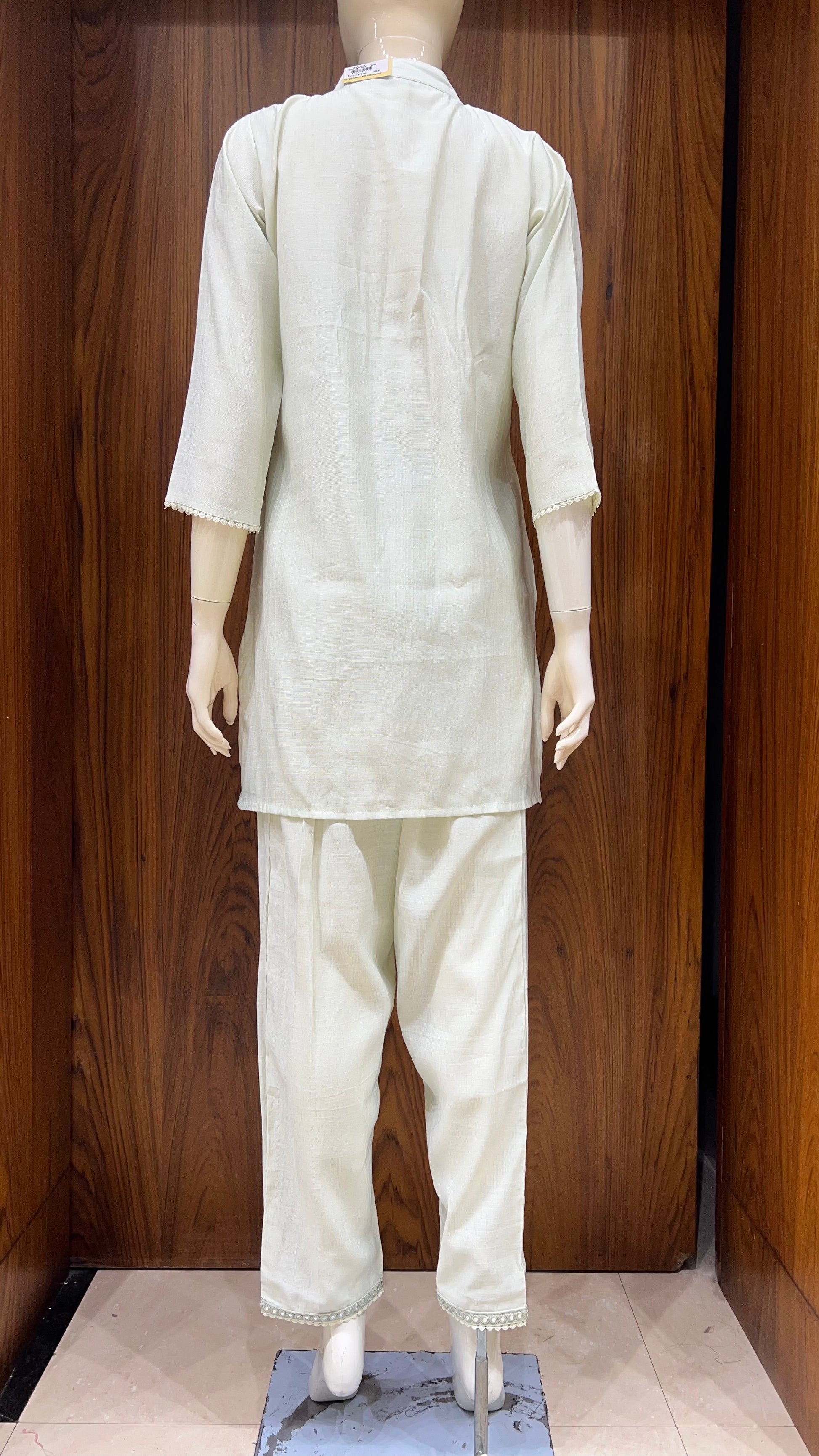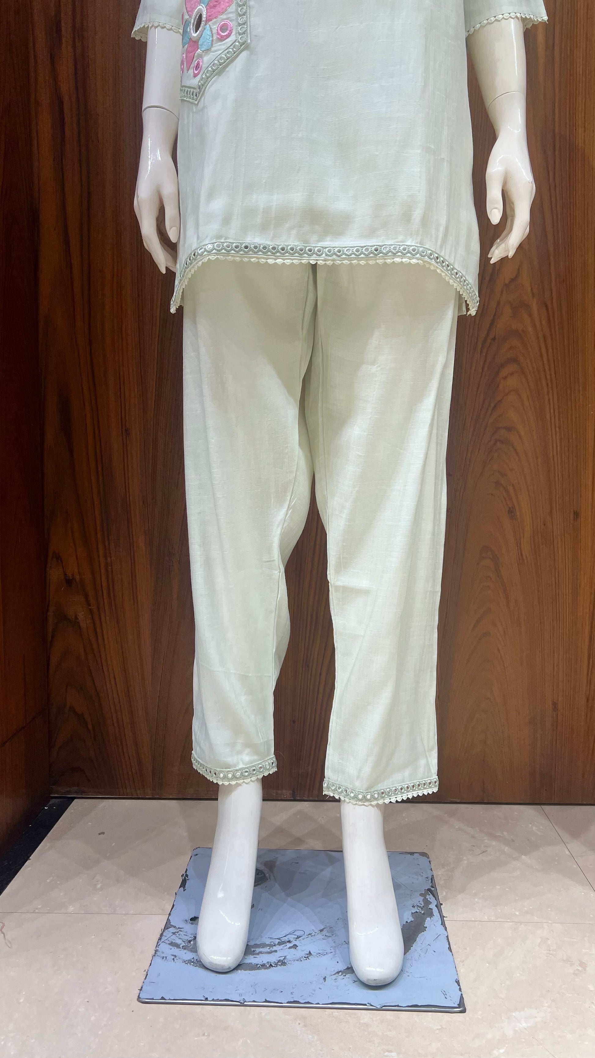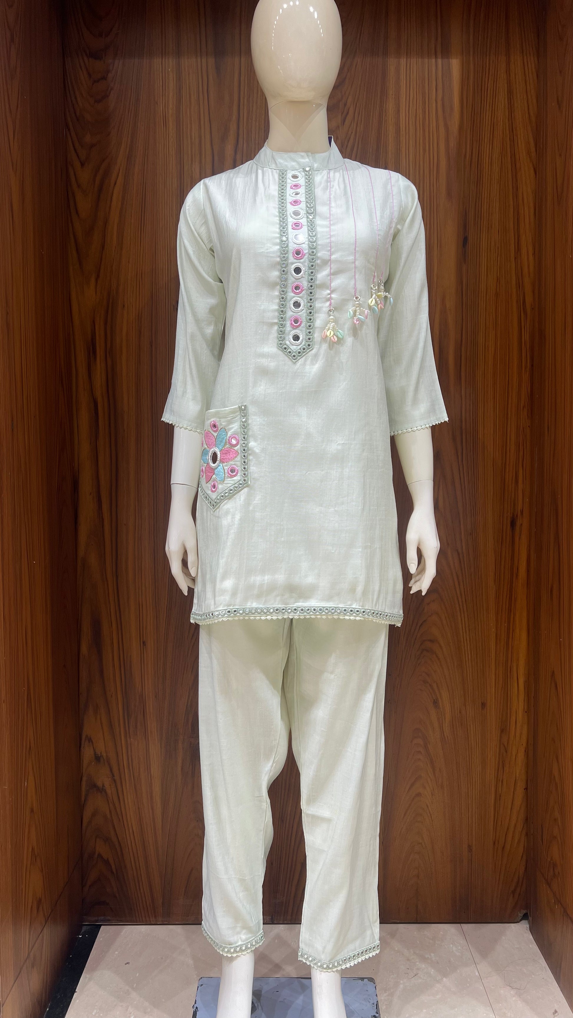 Step into a world of whimsical charm and artful elegance with our "Mint Mirage" Kurta Set. This enchanting two-piece ensemble is a celebration of playful details and traditional craftsmanship, reimagined in a fresh, modern way. The calming mint green hue is beautifully complemented by a delightful mix of mirror work, colorful embroidery, and dangling tassels, creating a look that is truly one-of-a-kind.