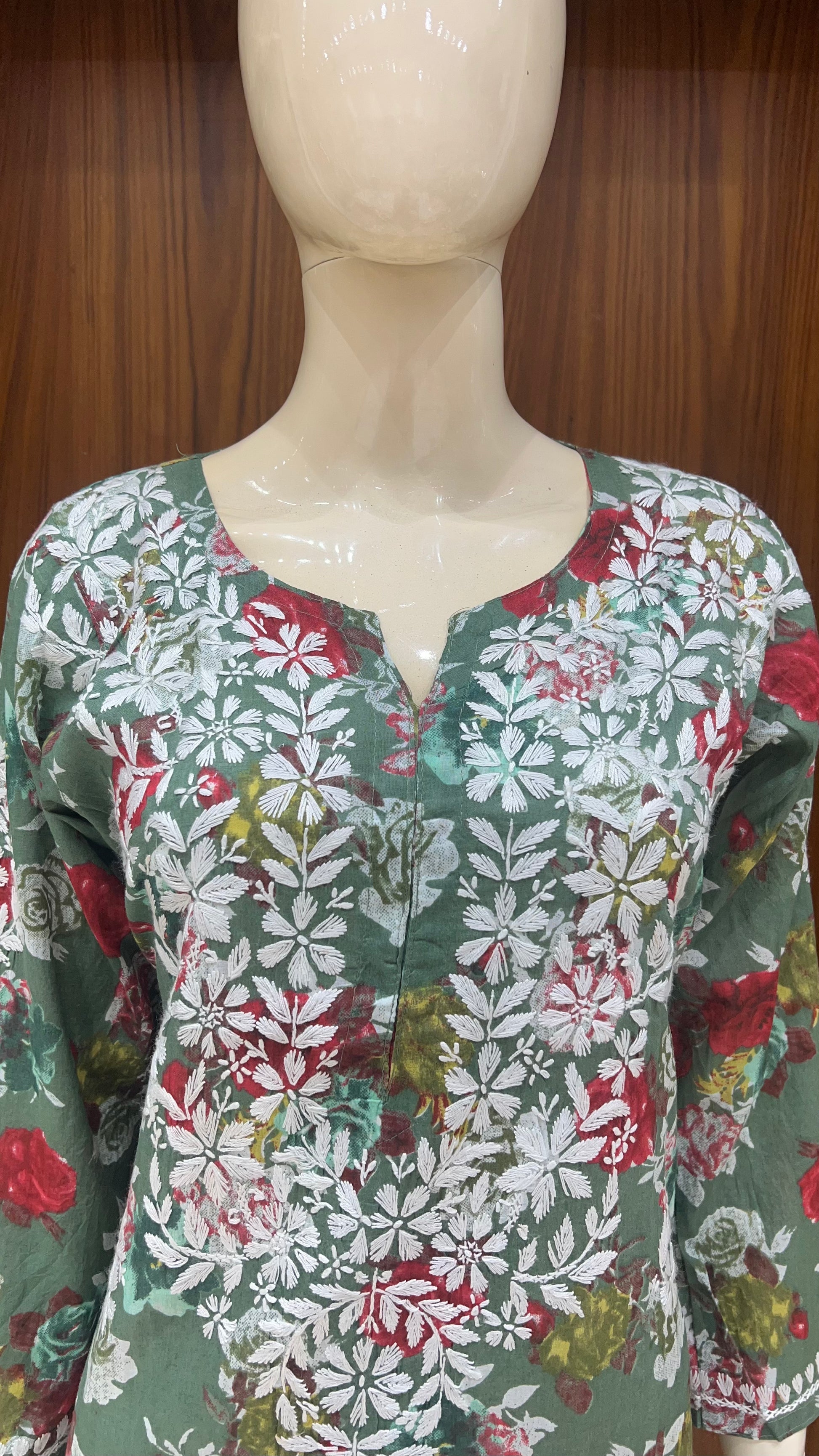 This olive green kurta blooms with charm, adorned with an all-over multi-colored floral print and elevated by a beautifully crafted white thread embroidery on the neckline and yoke. A perfect mix of tradition and style, this kurta is ideal for both casual outings and festive daywear.