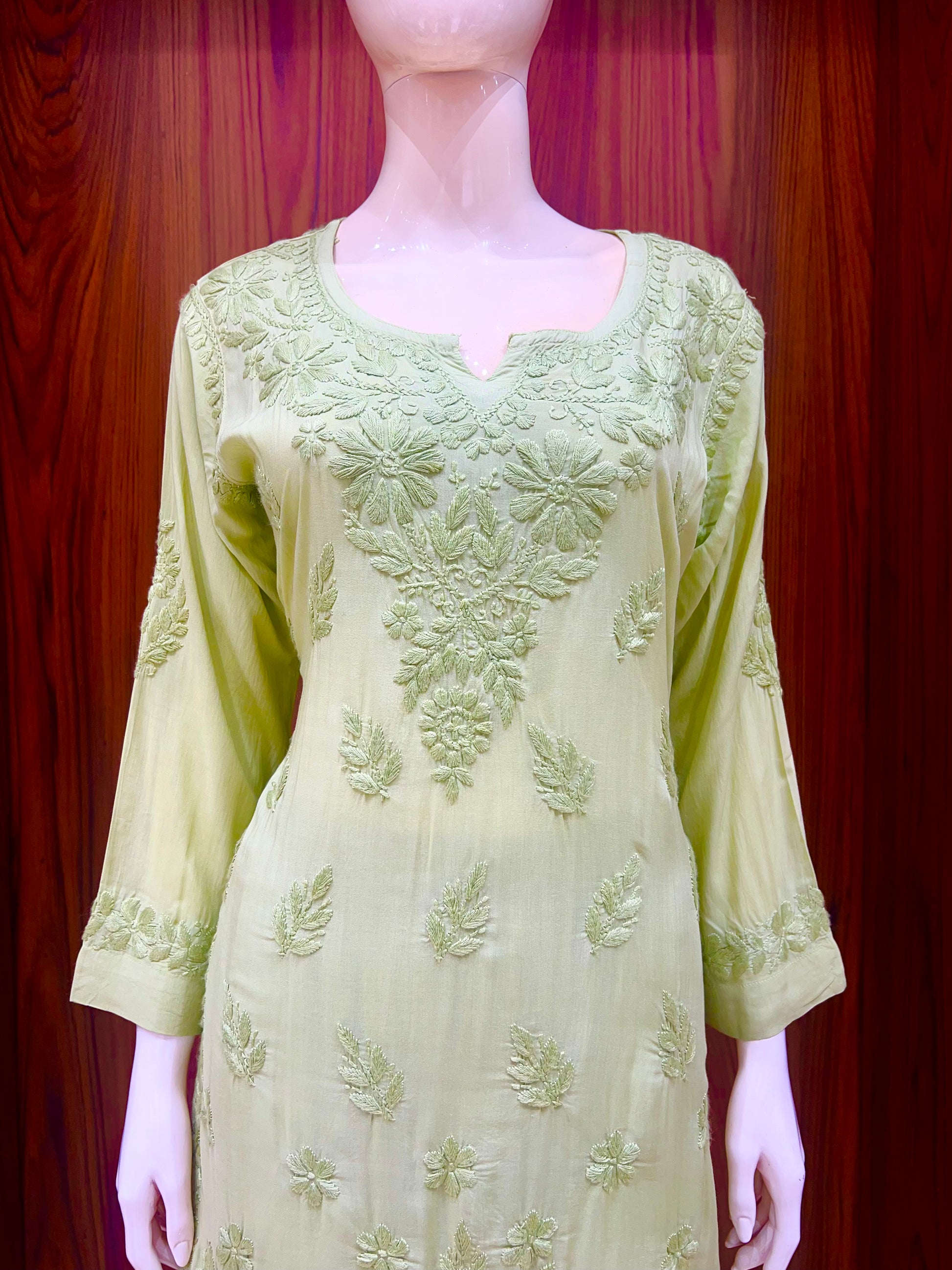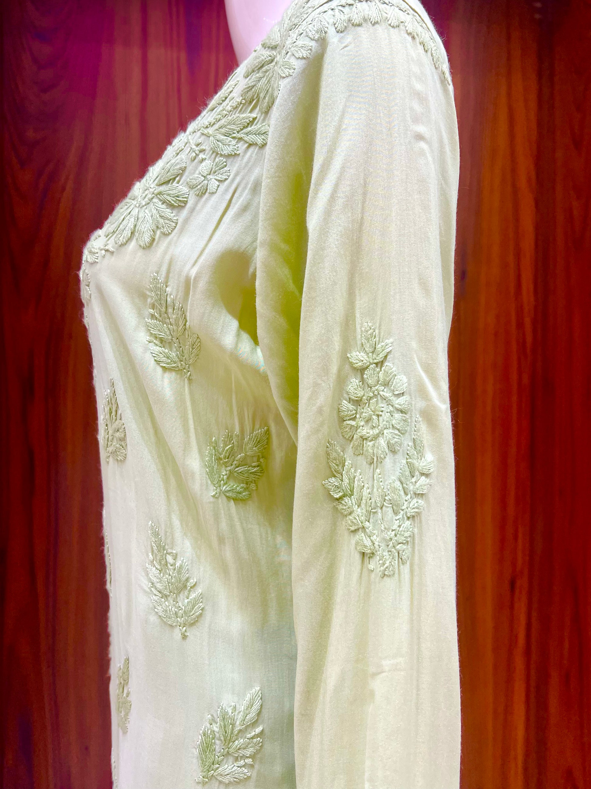 Step into elegance with this soothing pastel green co-ord set, designed to offer effortless style and comfort. The kurta features delicate self-color embroidery in floral and leaf motifs across the front, sleeves, and hem, giving it a graceful tone-on-tone texture. The round neckline with a subtle V-slit adds a refined touch to the classic silhouette.