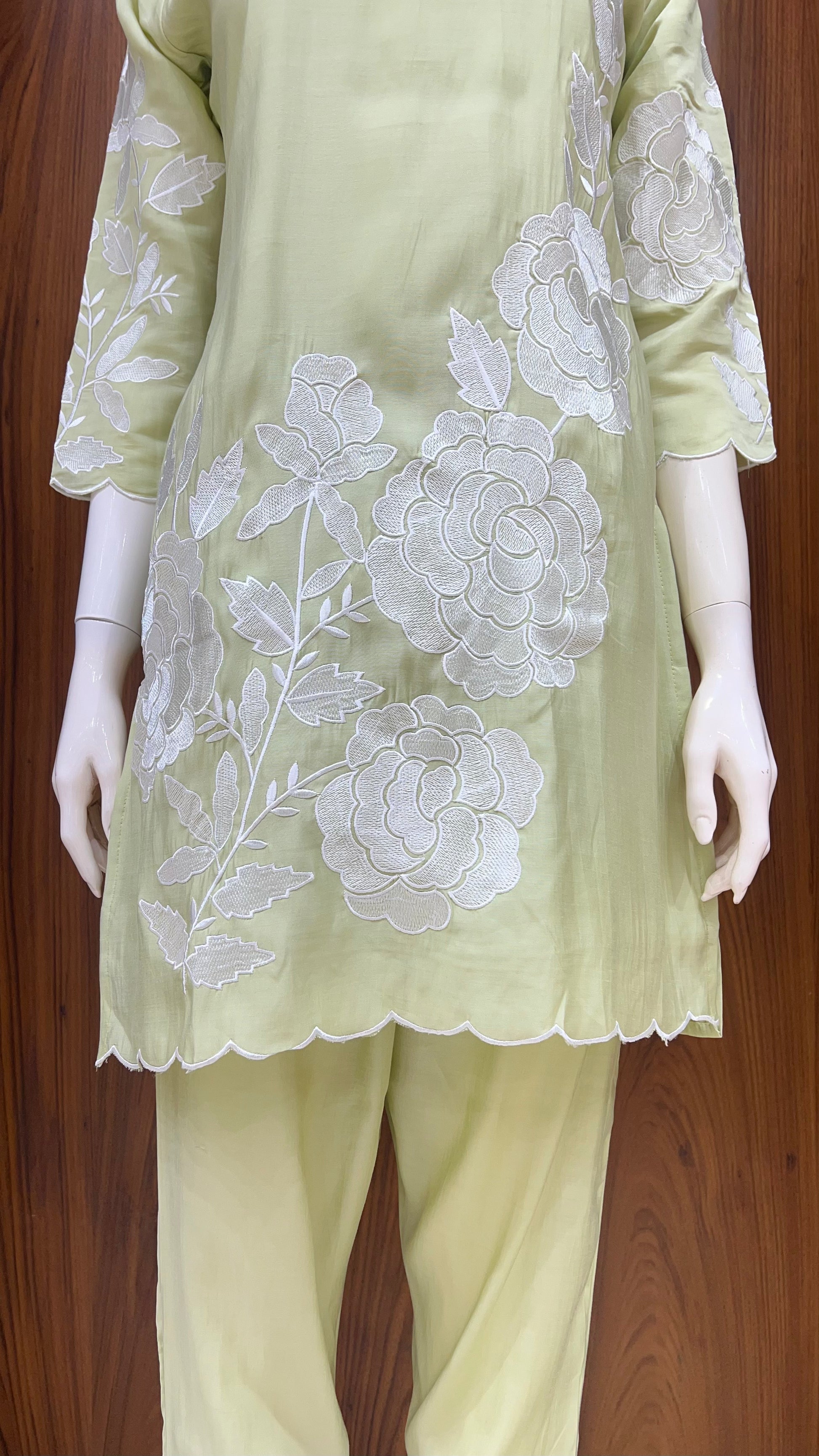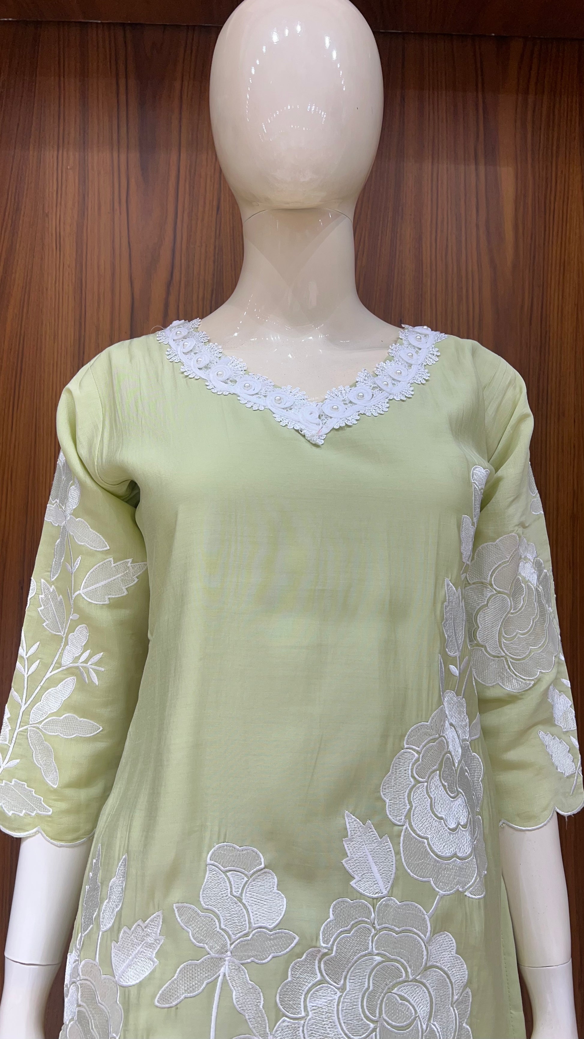 "Pista Rosette" - Pista Green Floral Applique Kurta Set