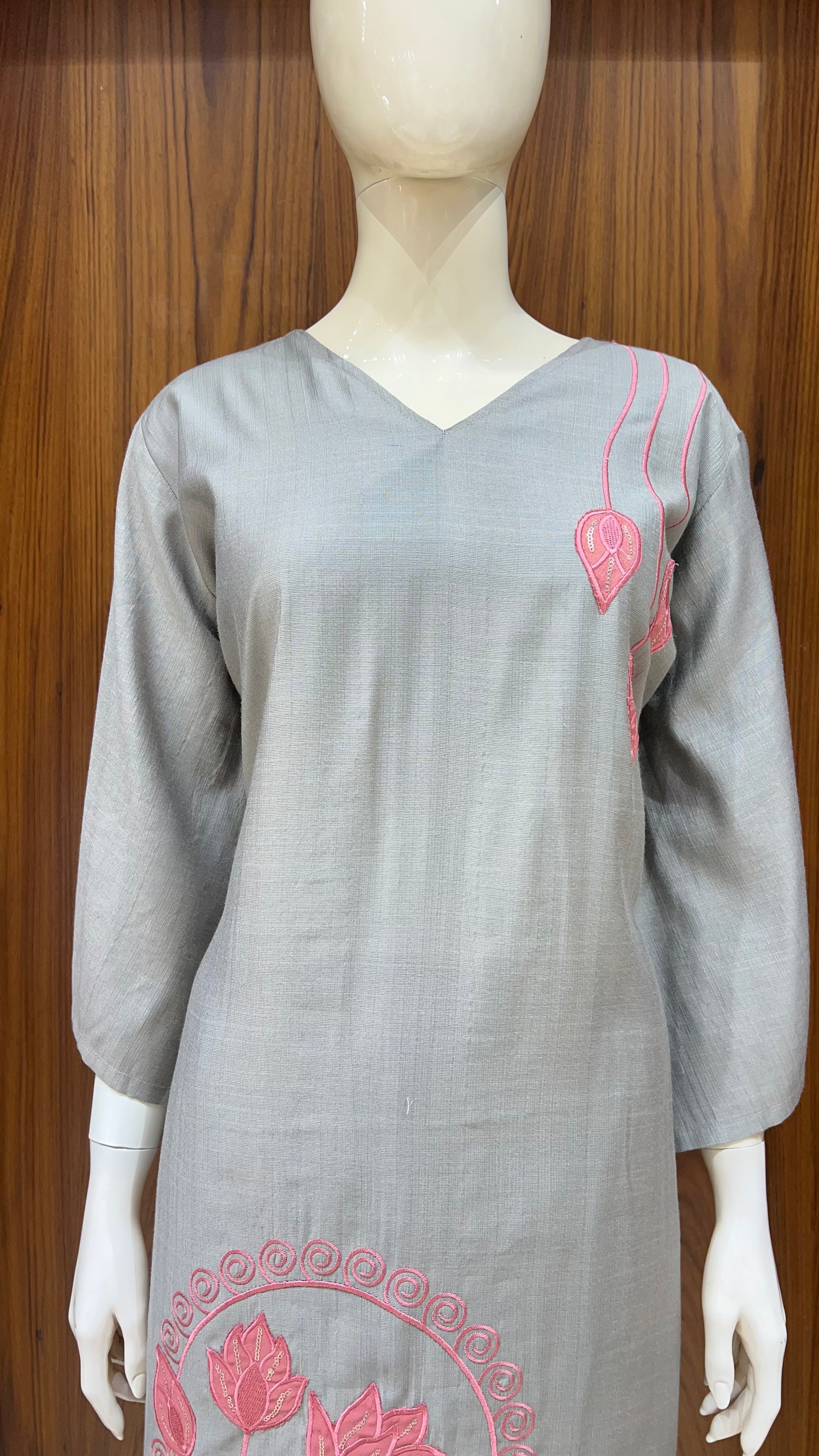 Find your calm in a world of elegance with our "Serene Lotus" Co-ord Set. This unique two-piece ensemble is an artistic interpretation of a timeless symbol, featuring beautifully rendered lotus embroidery on a sophisticated grey canvas. The soft pink hue of the embroidery provides a delicate and stunning contrast, creating a look that is both serene and deeply stylish.