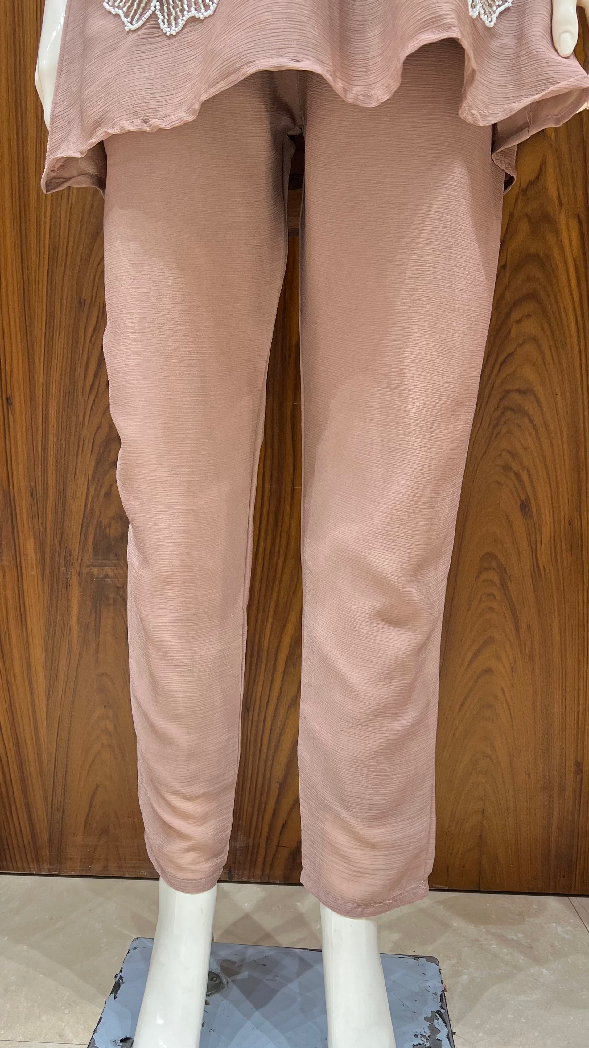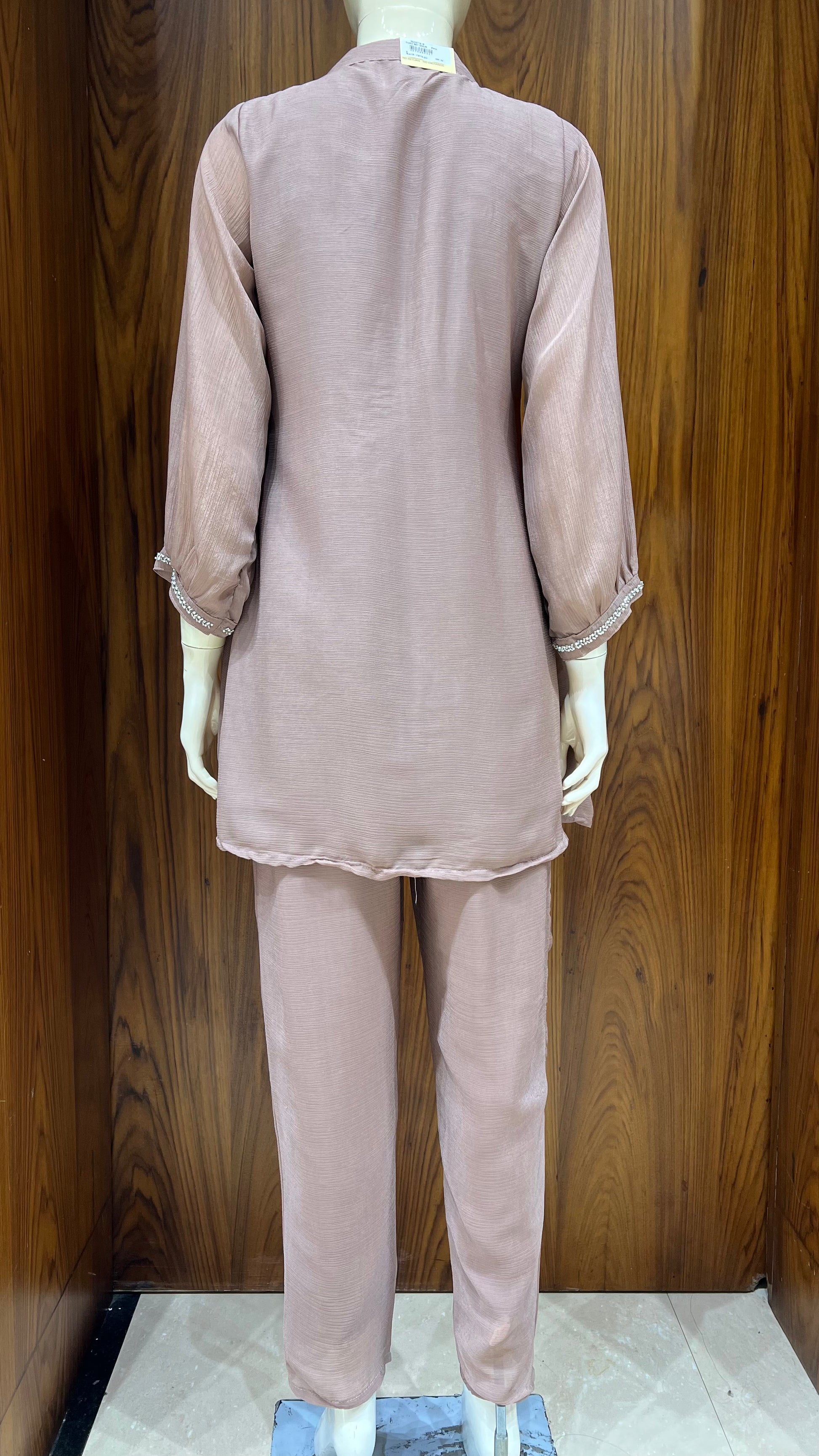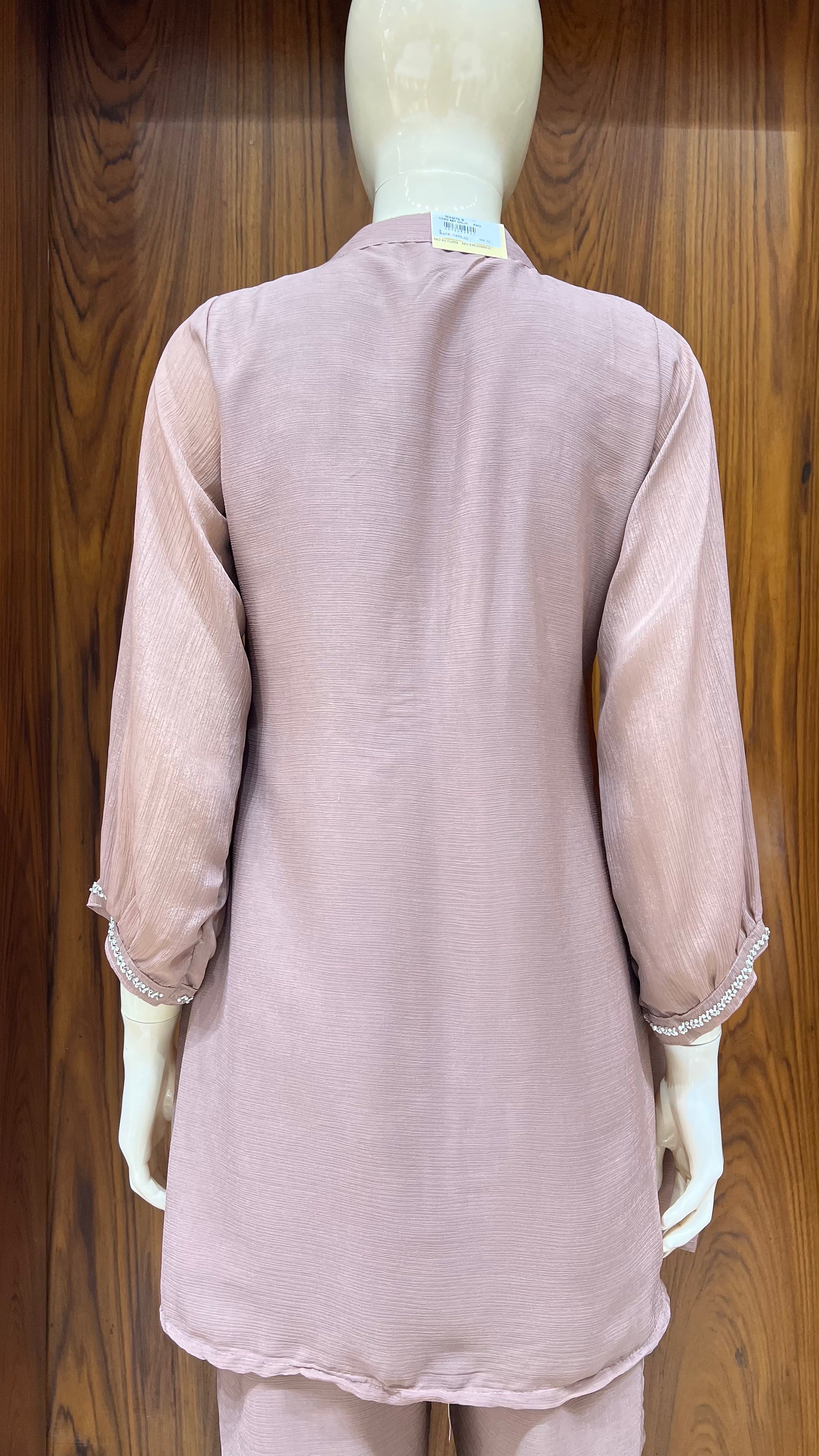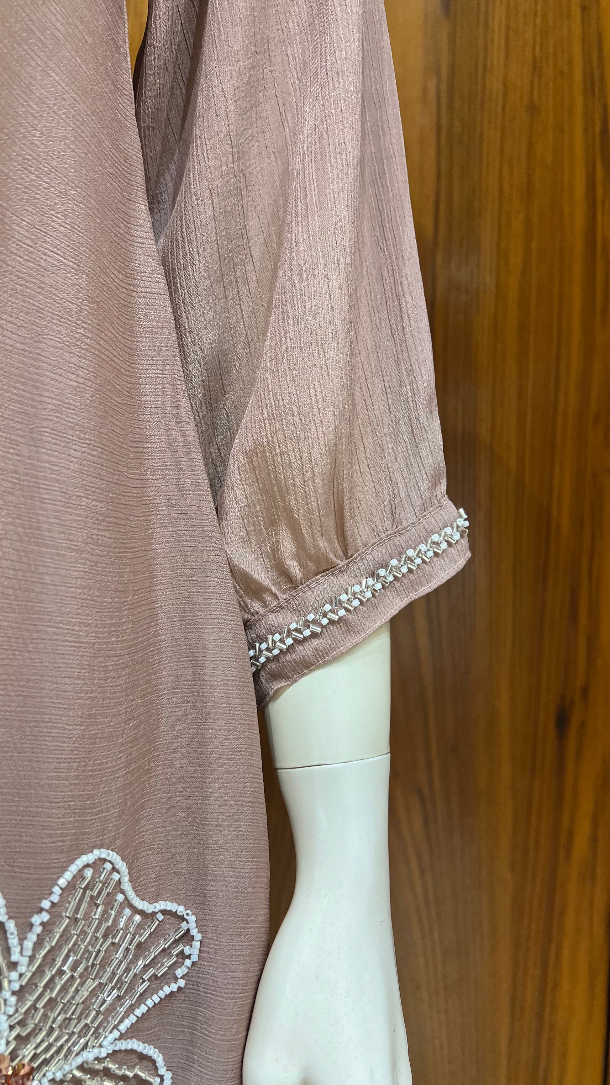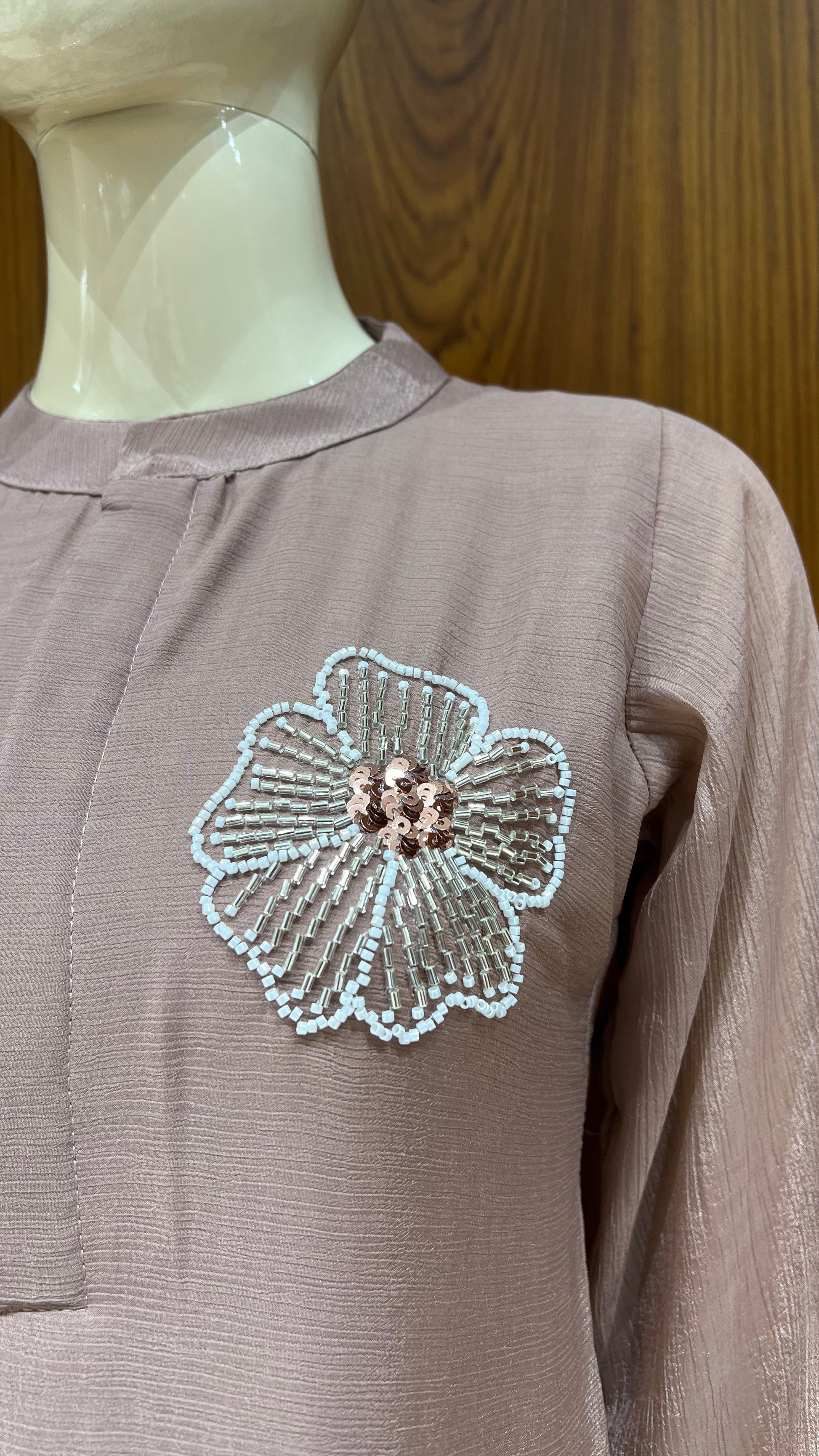 Drape yourself in understated elegance with our "Mauve Mist" Co-ord Set. This beautiful two-piece ensemble, in a sophisticated dusty pink hue, is a perfect example of modern grace. The design stands out with its delicately handcrafted floral motifs, which shimmer with intricate beadwork, adding a touch of subtle glamour to the relaxed silhouette.