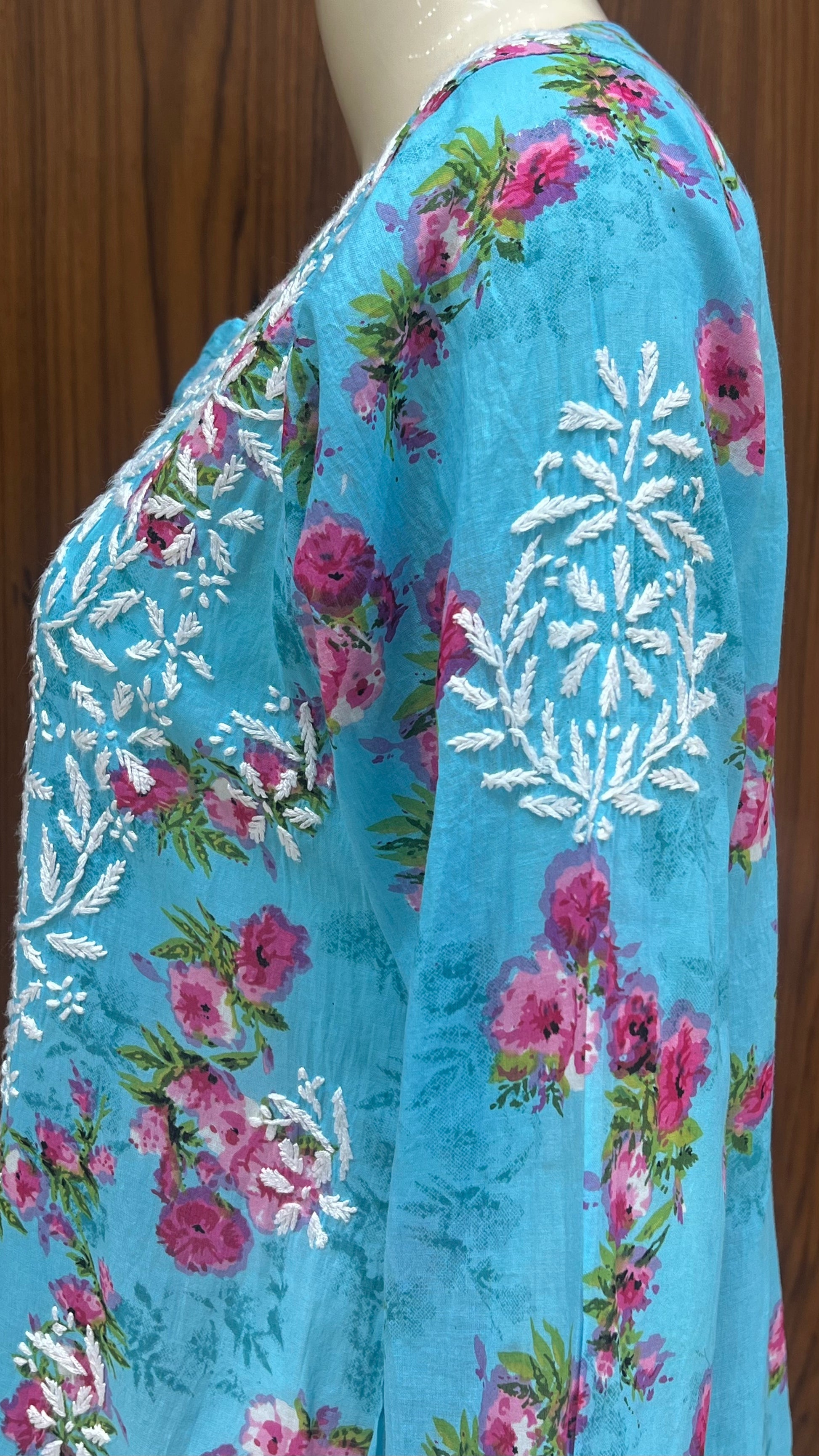 Step into summer freshness with this vibrant sky blue kurta, adorned with an all-over floral print in rich shades of pink and green. The kurta features subtle white thread embroidery in leafy and circular motifs around the neckline and chest area, adding a touch of elegance to the lively print. Perfect for day outings, casual workwear, or brunch gatherings, this piece blends traditional aesthetics with modern vibrance.