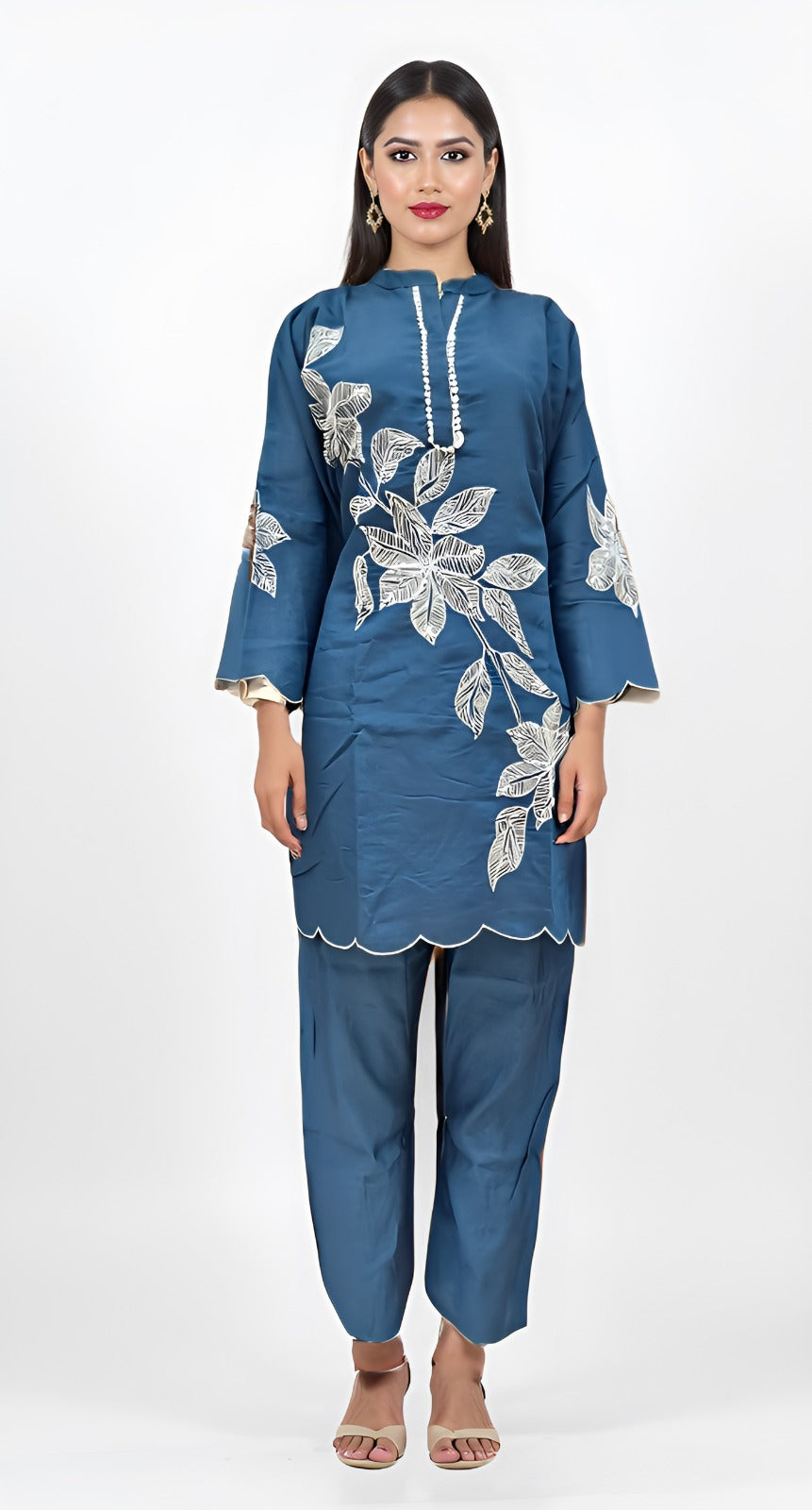 Teal Blue Embroidered Co-ord Set with Scalloped Hem and Leaf Motifs