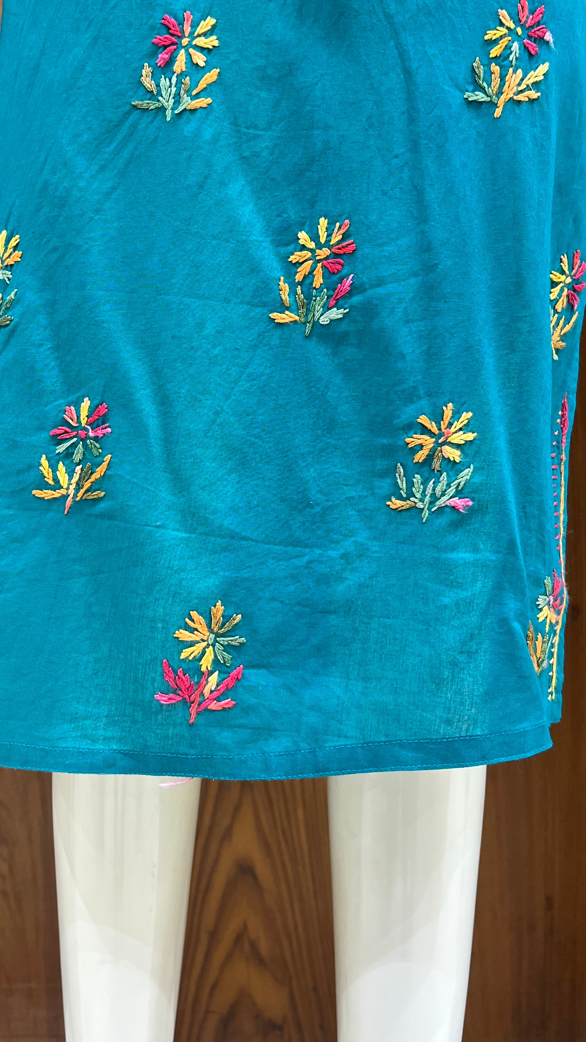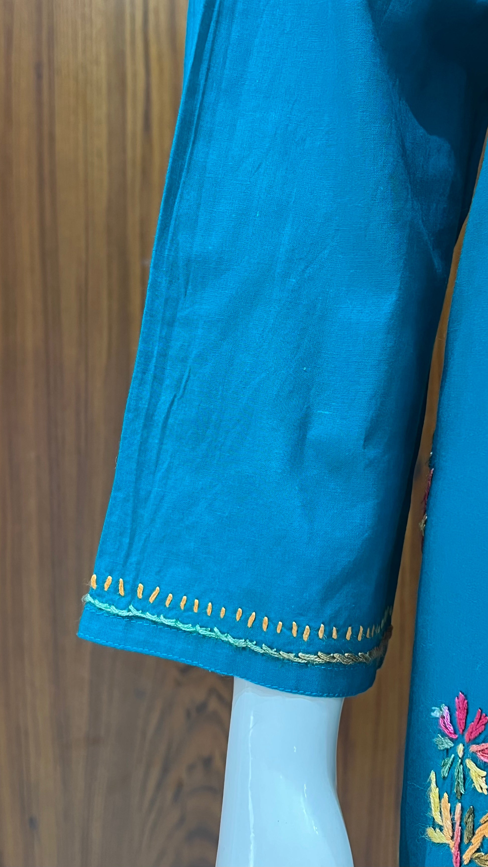 Elevate your ethnic style with this vibrant teal green kurta, featuring eye-catching multicolor thread embroidery in floral and leaf motifs. The beautifully crafted embroidery around the yoke and scattered throughout the kurta gives it a festive charm with a youthful flair. It’s perfect for day outings, festive occasions, or casual office wear.