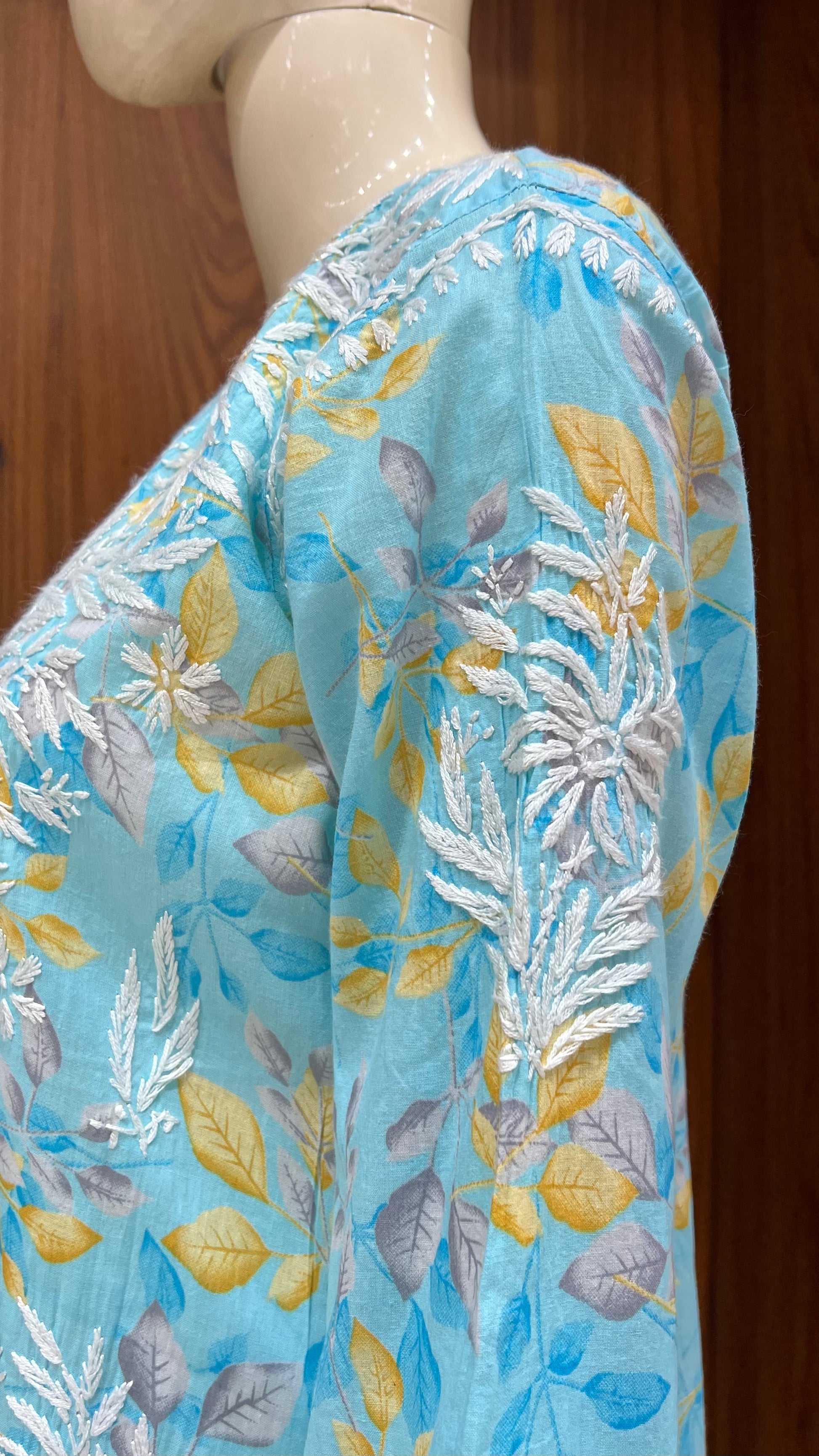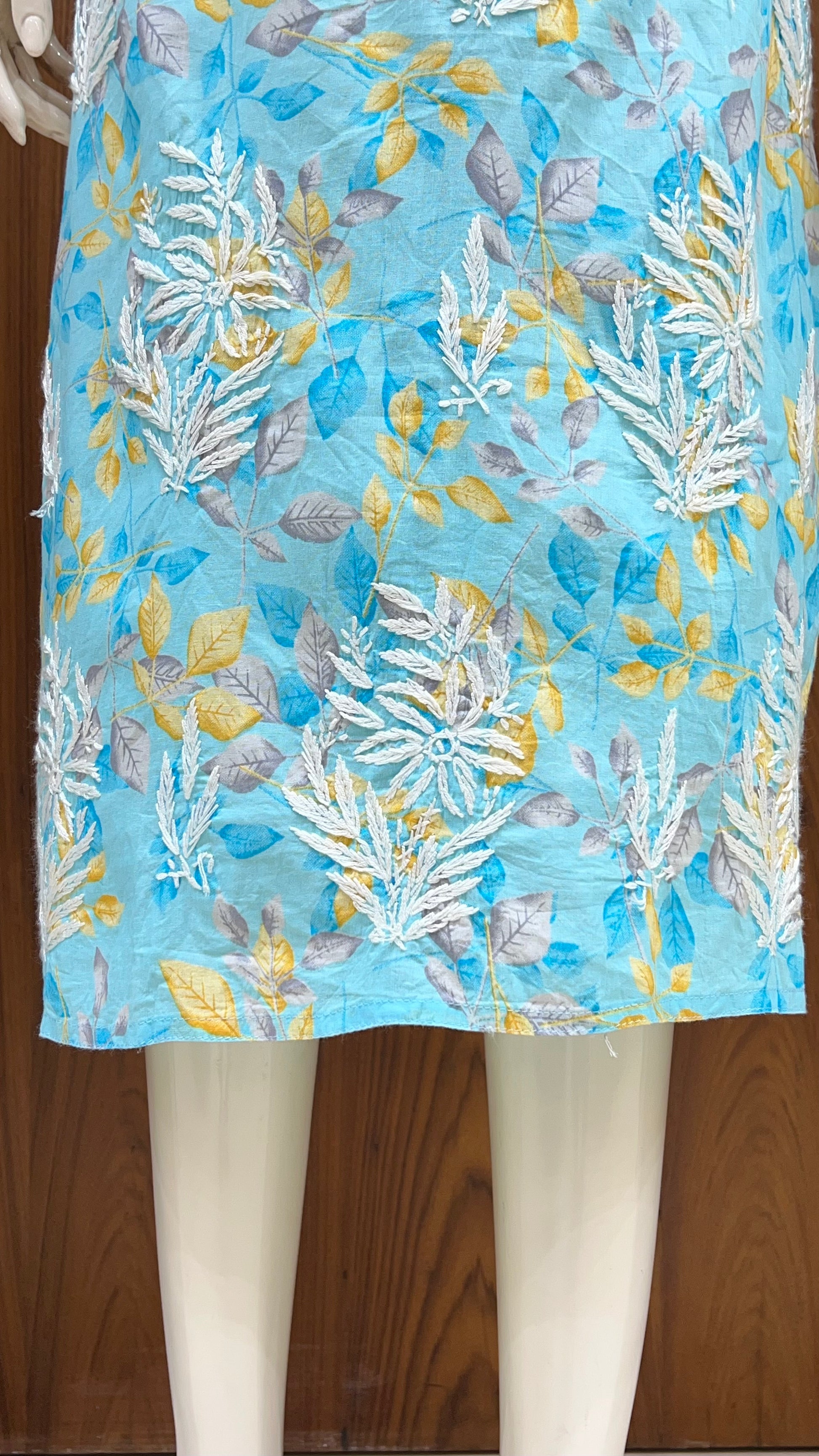 Brighten up your day with this stunning turquoise floral kurti, a perfect fusion of vibrant prints and elegant traditional embroidery. This piece is designed to make a statement with its lively color palette and artistic details.